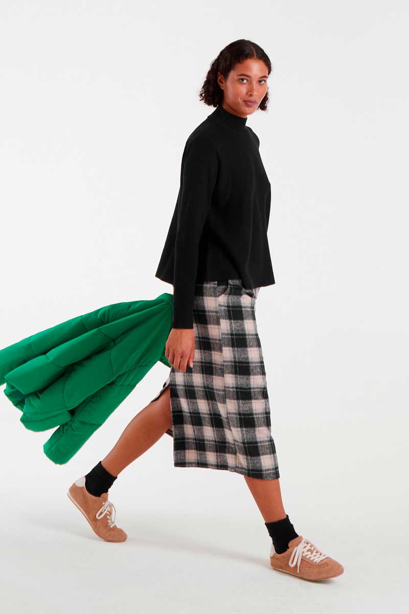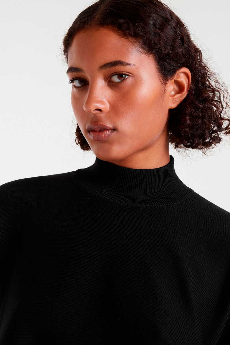 Μαύρο πλεκτό πουλόβερ με στρογγυλή λαιμόκοψη και μακριά μανίκια. Σιλουέτα σε γραμμή Α. Ριπ λεπτομέρειες.