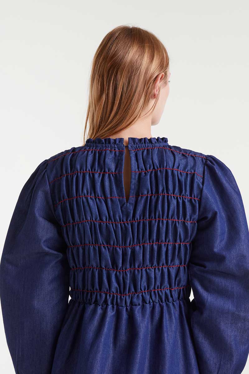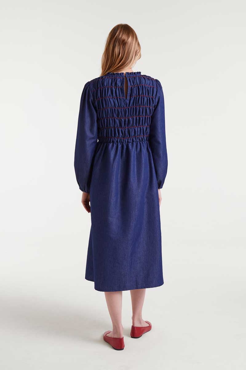 Μπλε midi τζιν φόρεμα. Σχέδιο με κυψέλη που εφαρμόζει στο σώμα μπροστά και πίσω και κόκκινες ραφές.