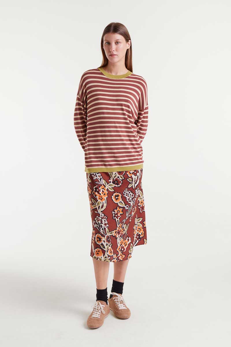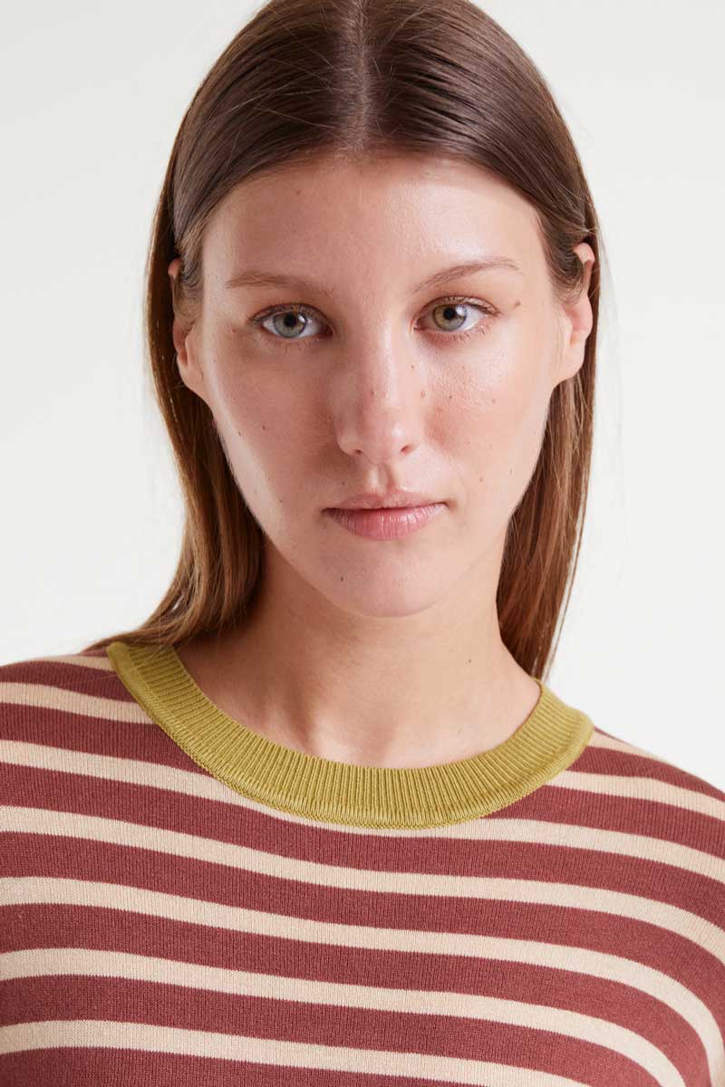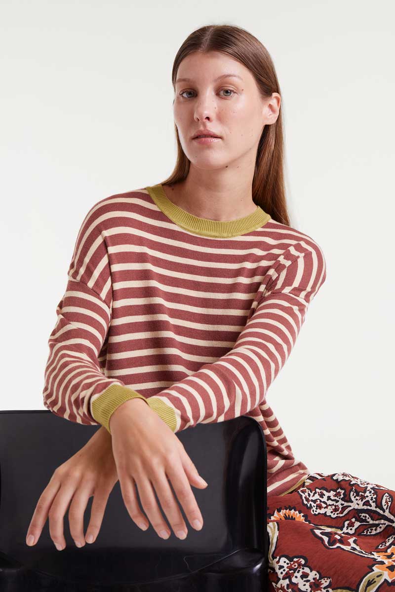 Πλεκτό πουλόβερ με καφέ και λευκές ρίγες.