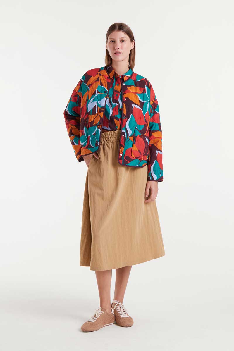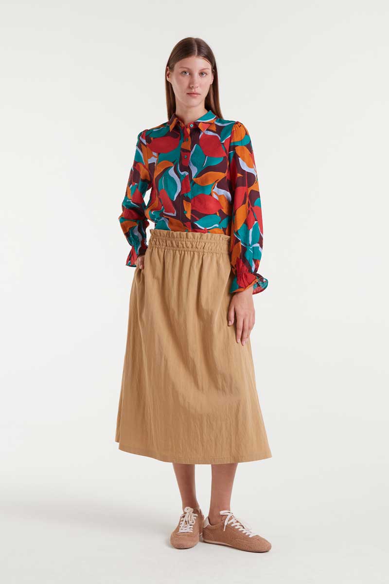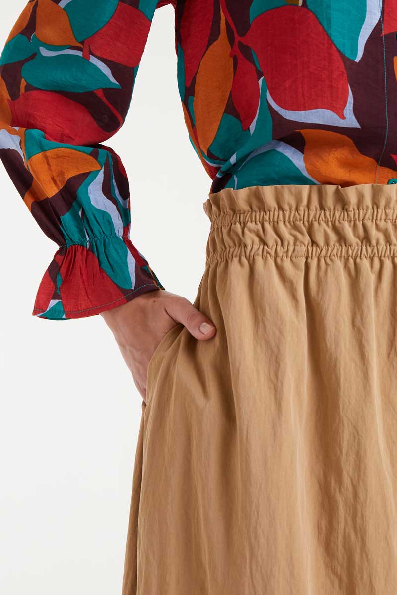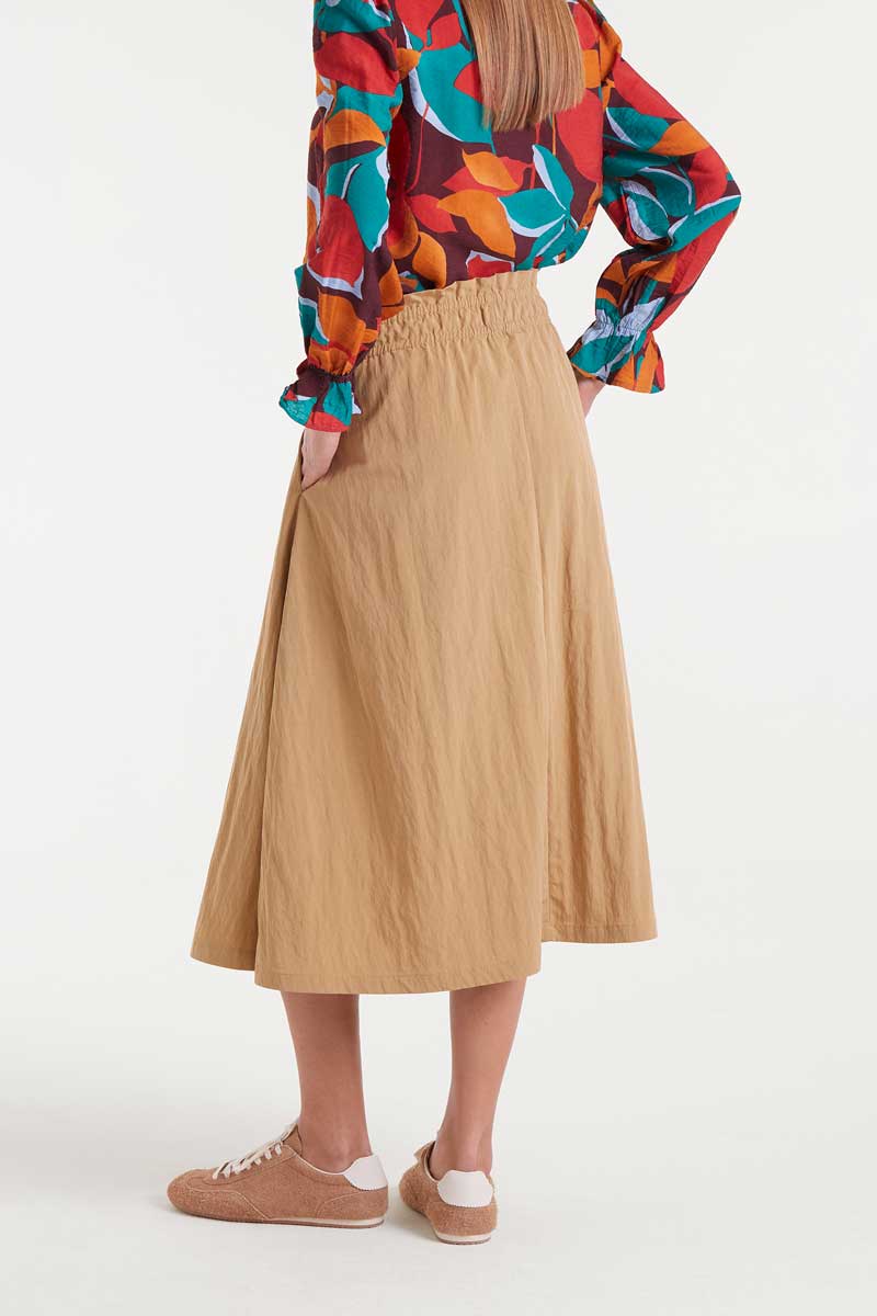 Μίντι φούστα σε ραγιόν ύφασμα σε καμηλό χρώμα.