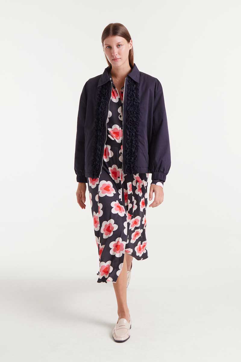 Μακριά μανίκια με μανσέτα, κλείσιμο μπροστά με κουμπιά και ζώνη από το ίδιο ύφασμα.