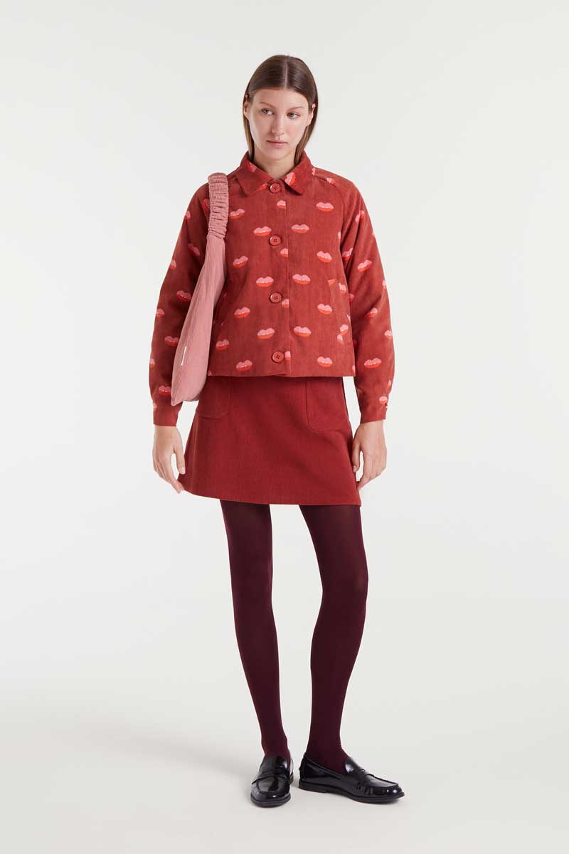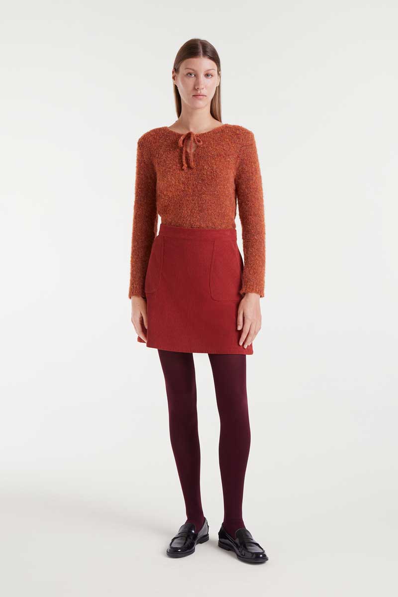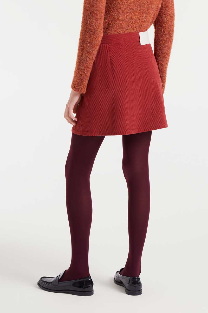 Κοντή ψηλόμεση φούστα από καφέ κοτλέ ύφασμα με κρυφό φερμουάρ στο πλάι. Πλαϊνές τσέπες.