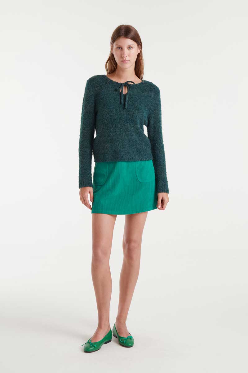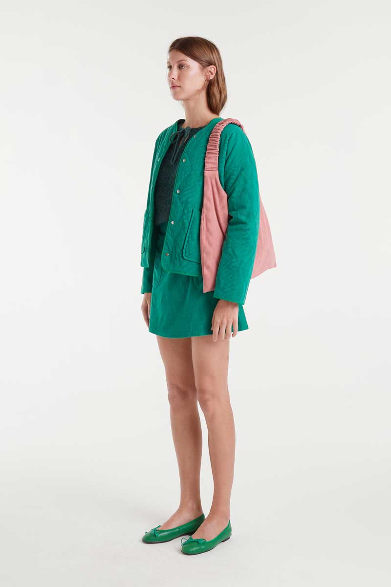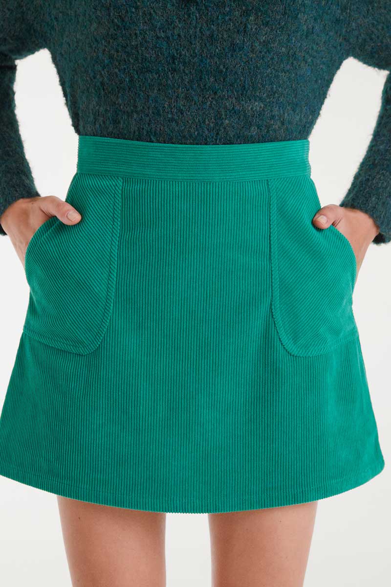 Κοντή ψηλόμεση φούστα από πράσινο κοτλέ ύφασμα με κρυφό φερμουάρ στο πλάι. Πλαϊνές τσέπες.