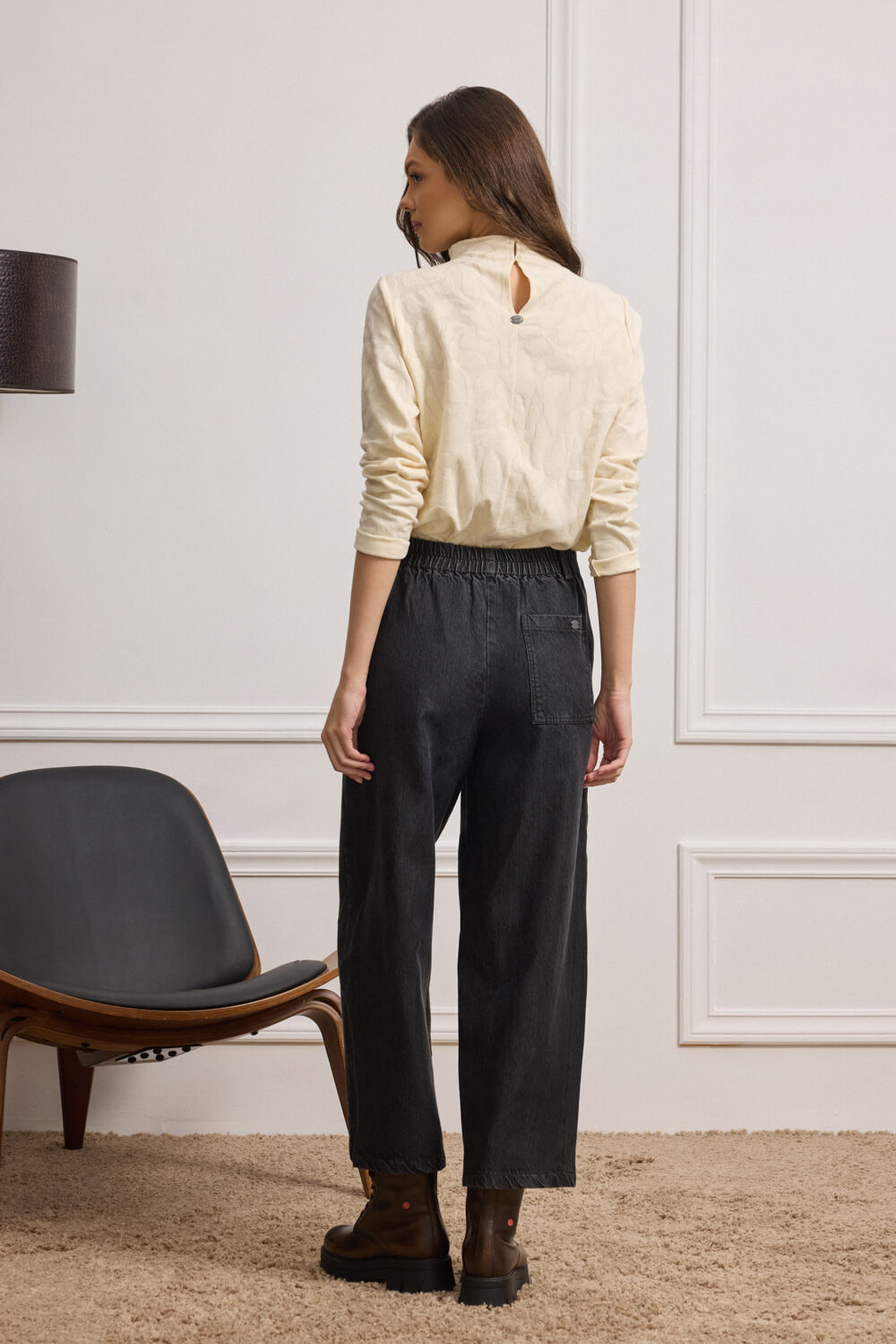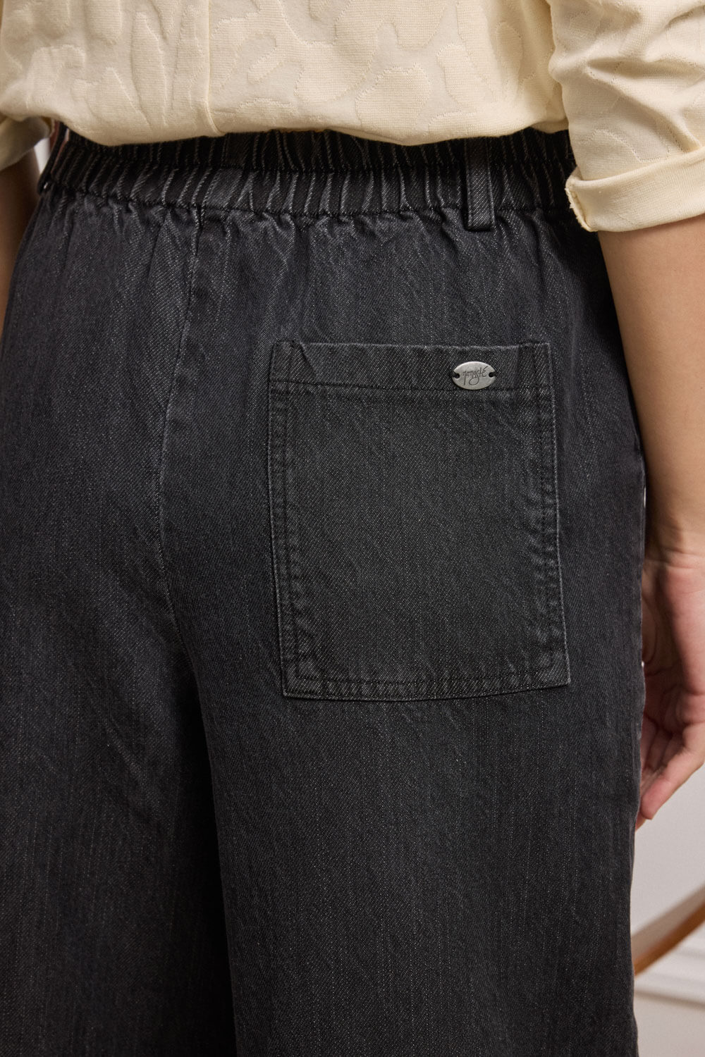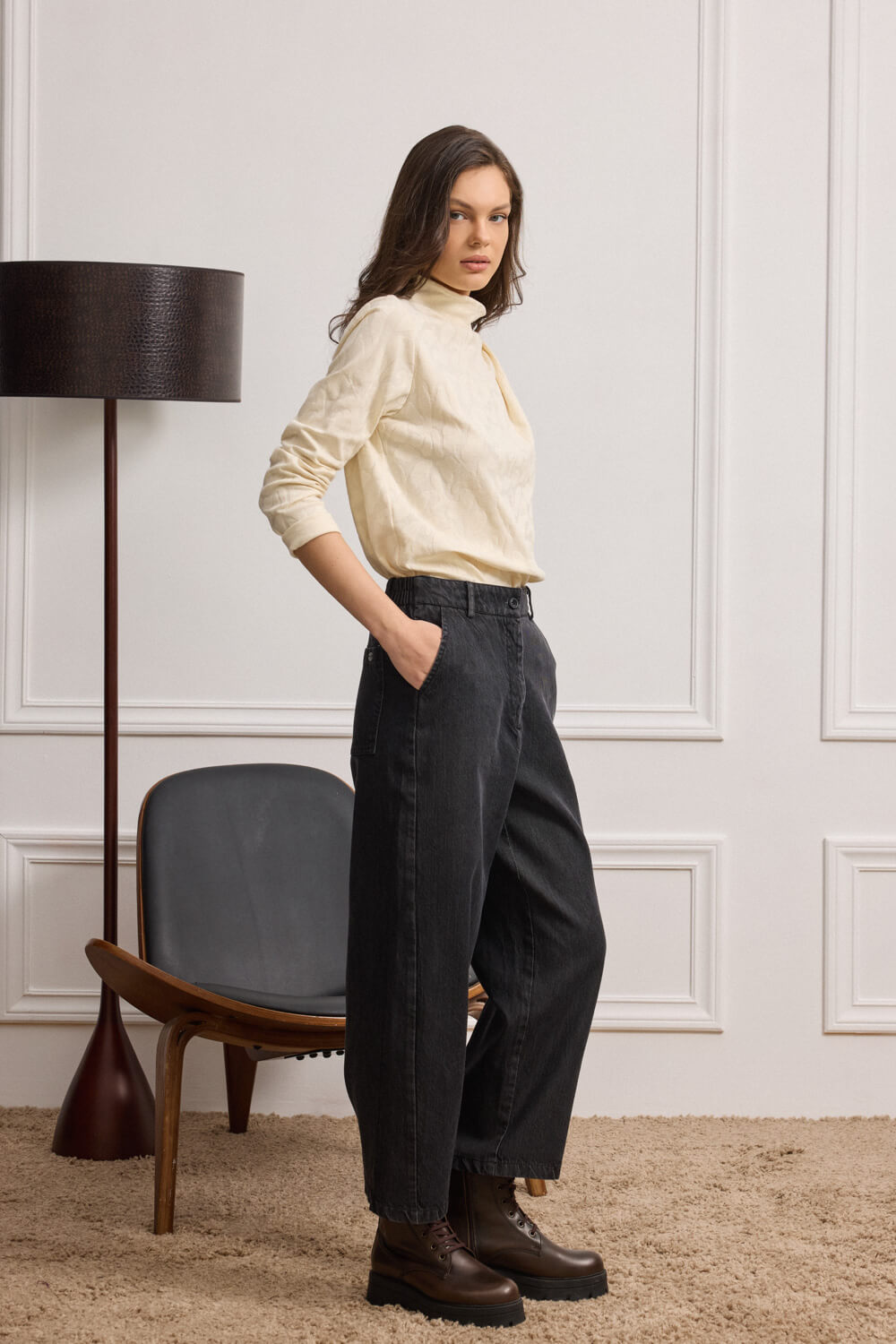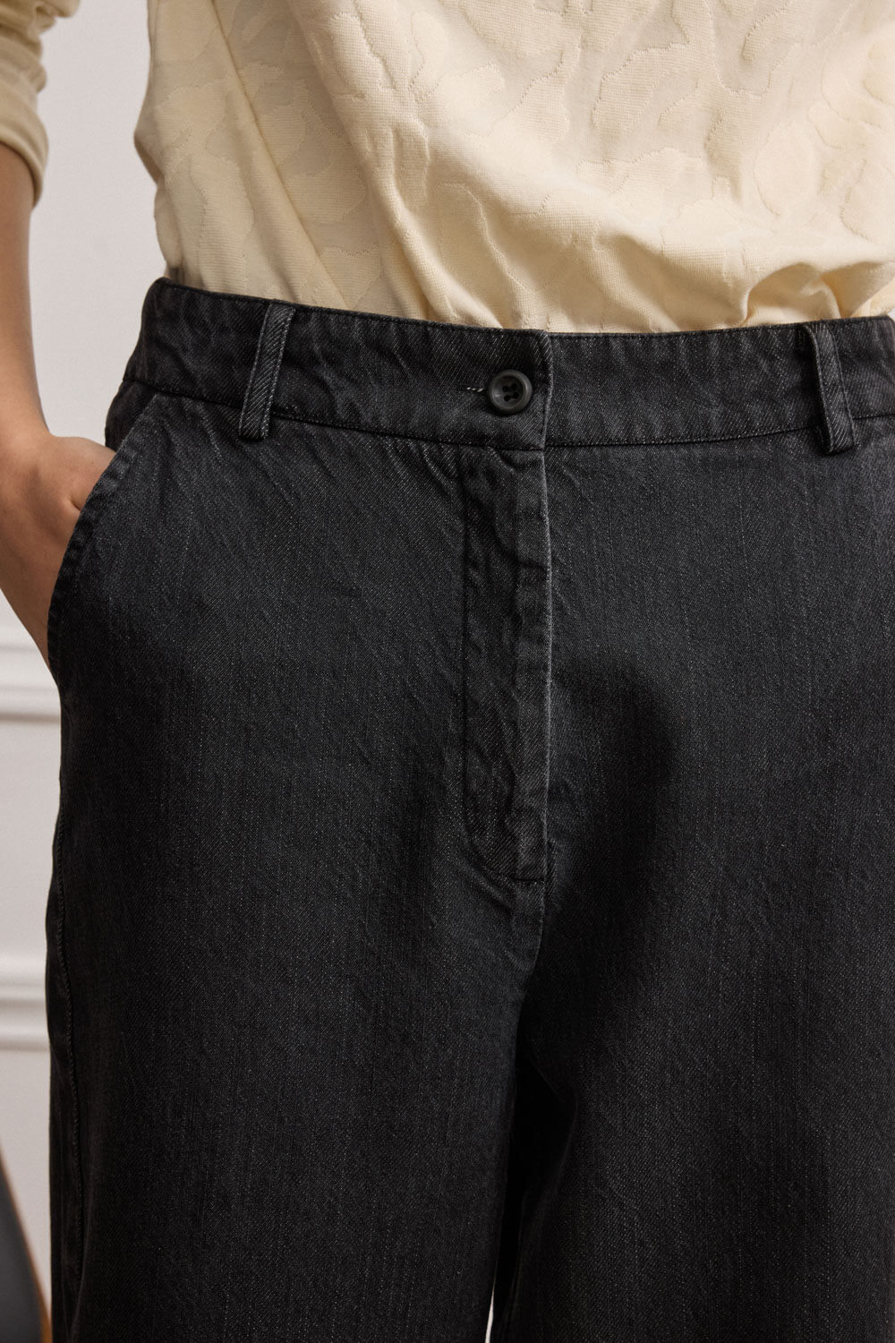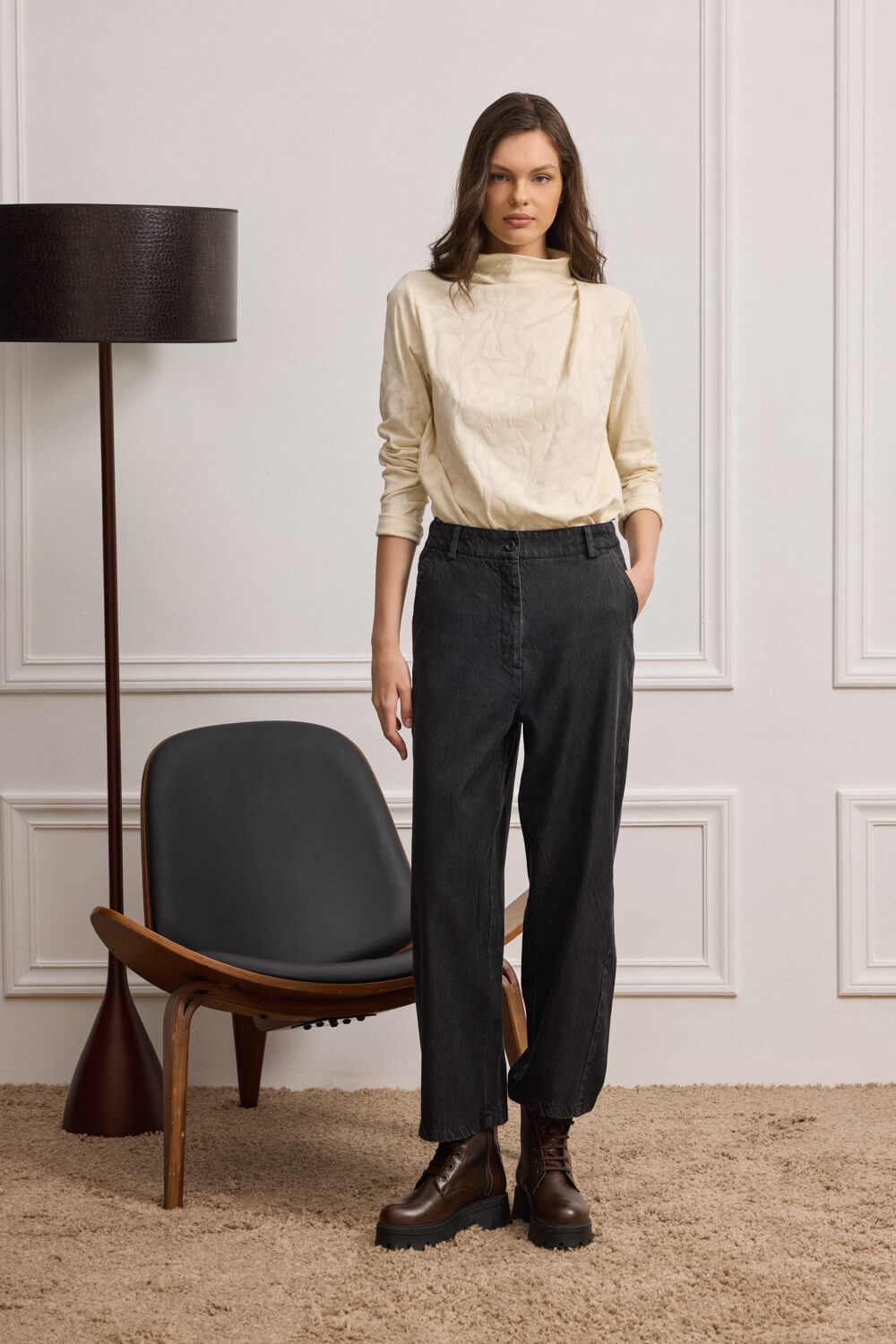 Παντελόνι μαύρο denim σε ίσια γραμμή που κλείνει ελαφρώς στο κάτω μέρος κλασικό και ευέλικτο συνδυάζοντας άνεση και πρακτικότητα .