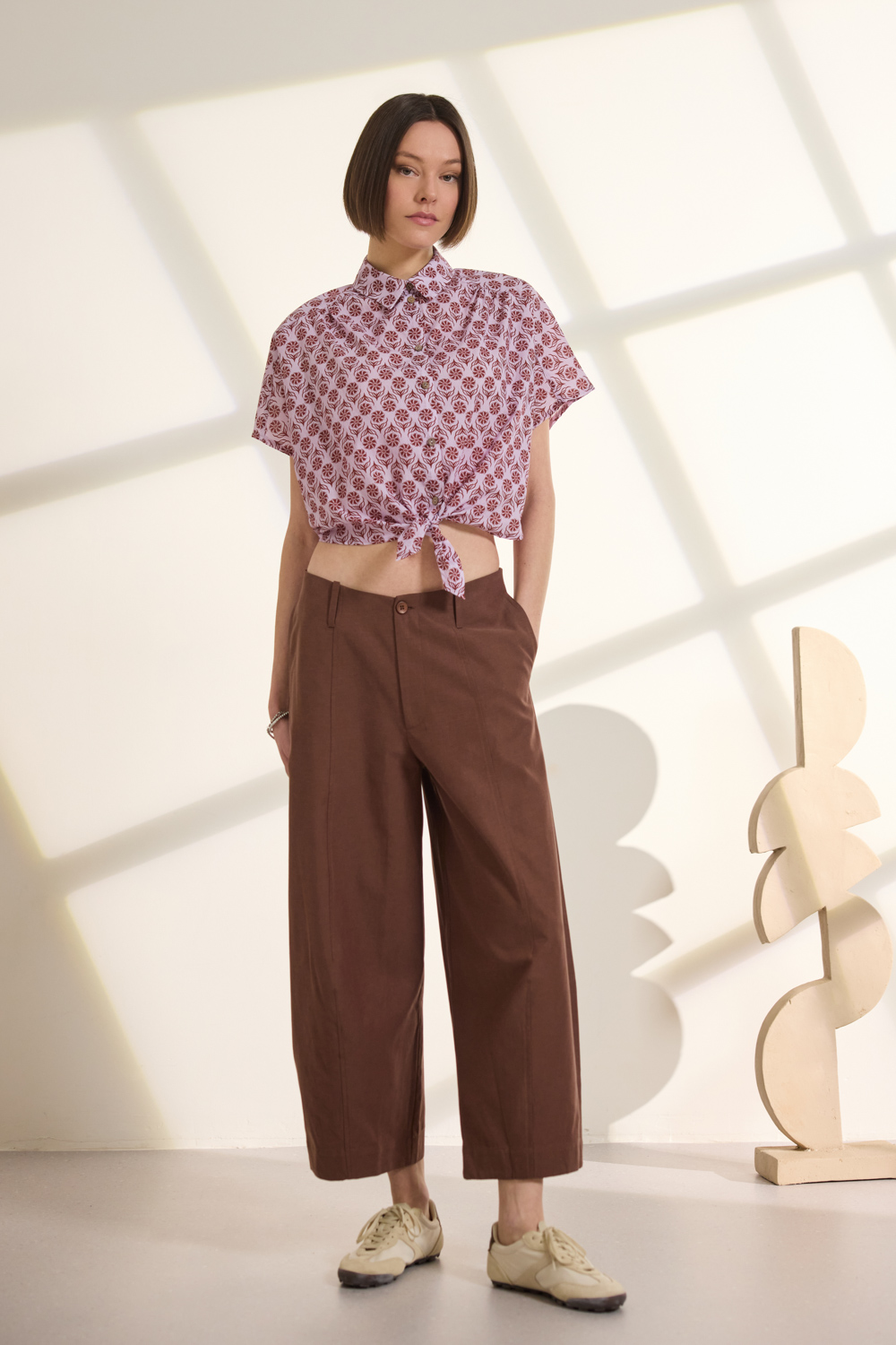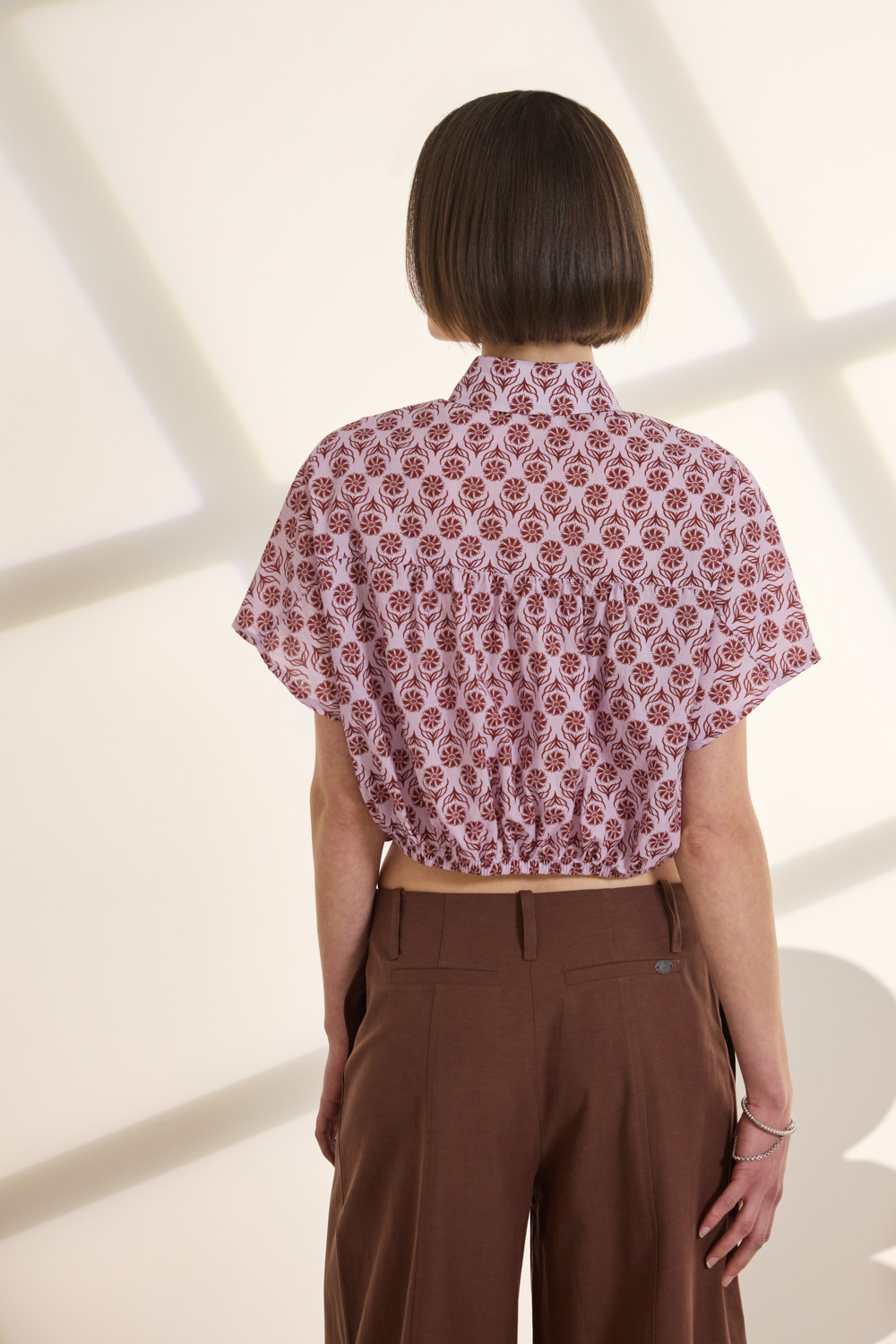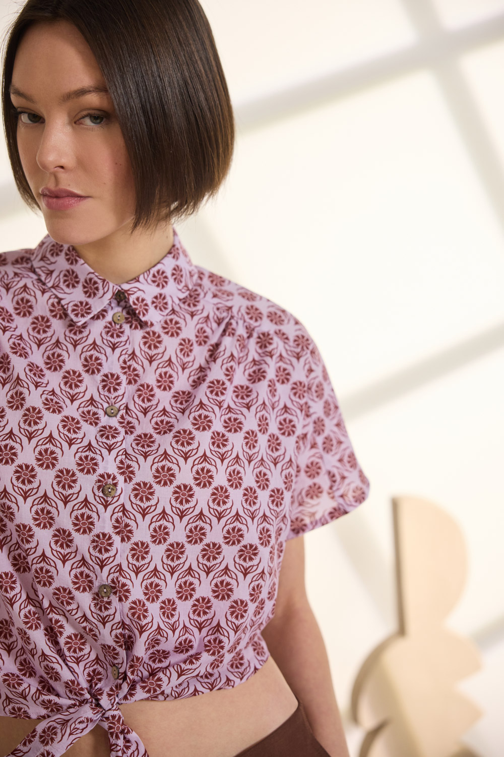 Cropped πουκάμισο από δροσερό 100% βαμβάκι, με γιακά και μπροστινό κλείσιμο που καταλήγει σε ιδιαίτερο δέσιμο στο τελείωμα.