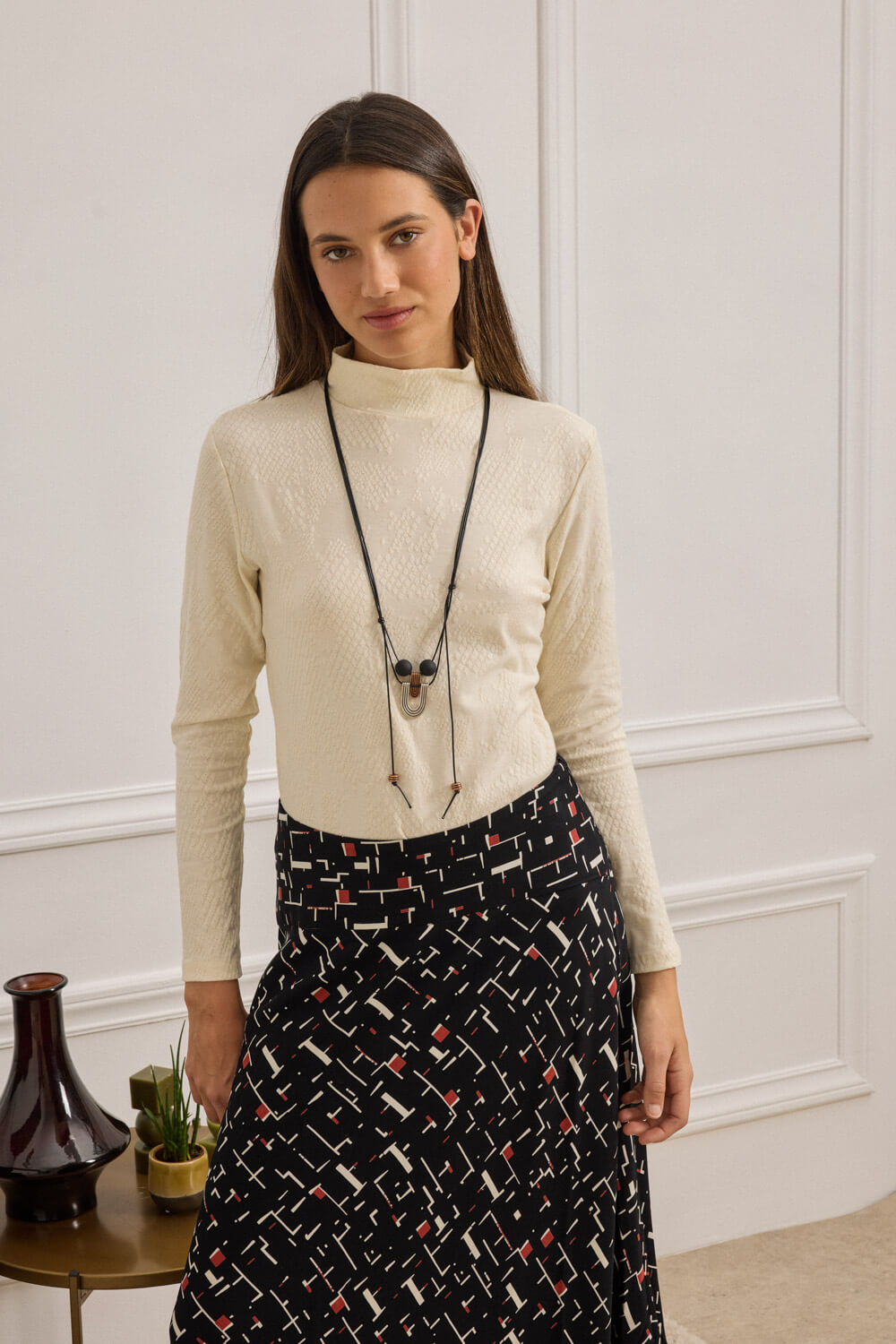 Μπλούζα με κομψή, μίνιμαλ αισθητική και ανάγλυφο ζακάρ μοτίβο, που προσθέτει υφή και χαρακτήρα.