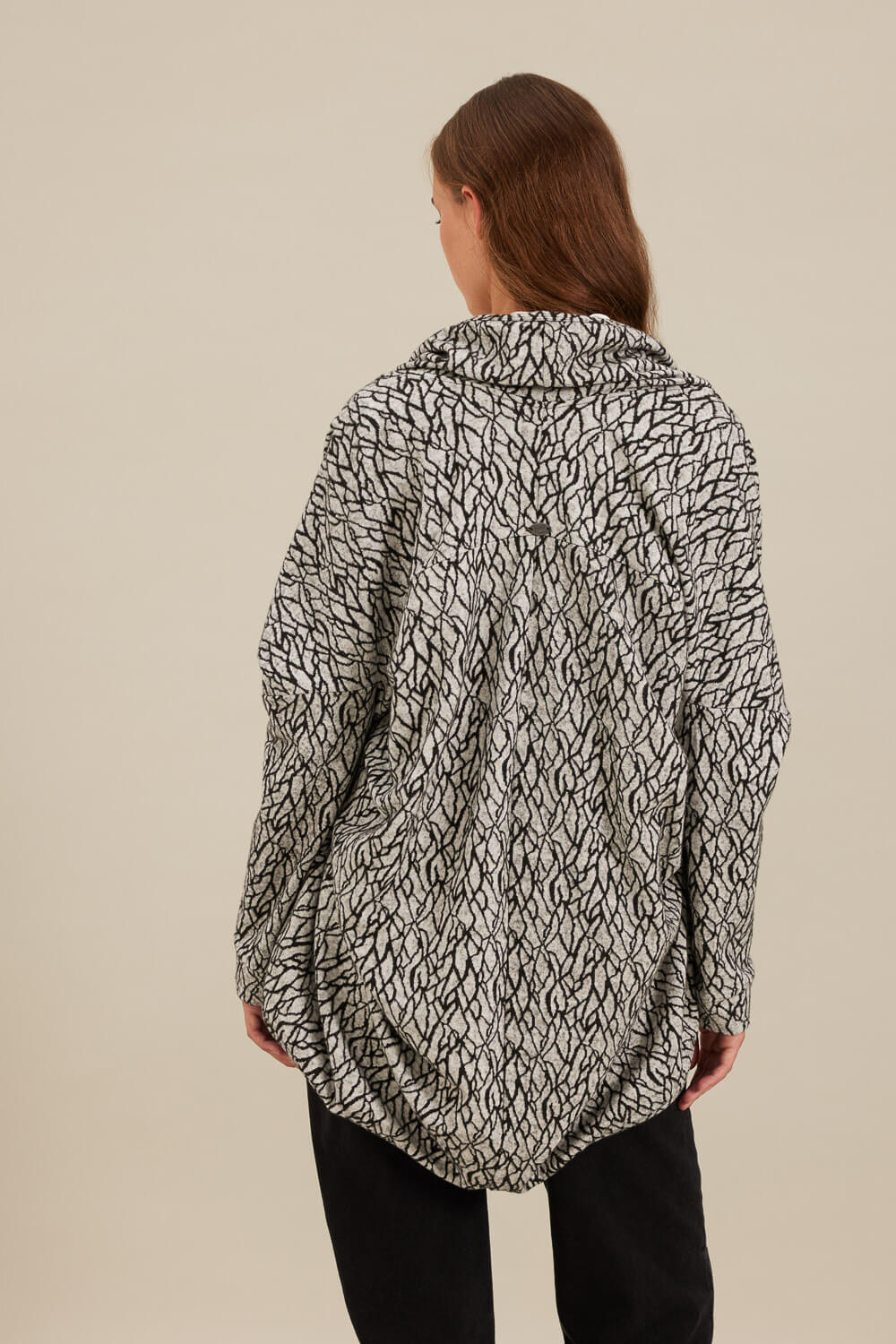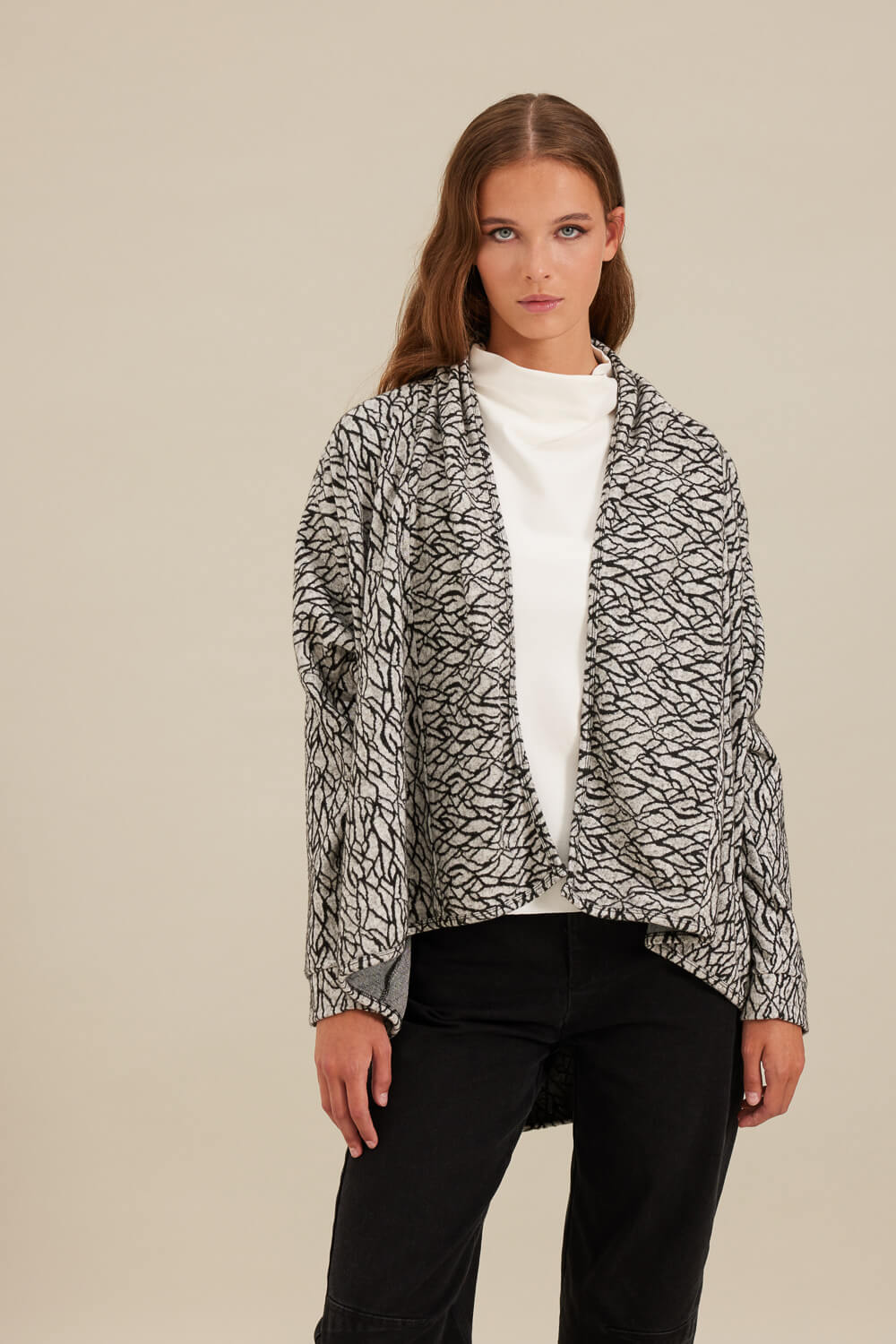 Σε εμπριμέ ζέρσεϊ ζακάρ με γκρίζες αποχρώσεις και μαύρα χρώματα.