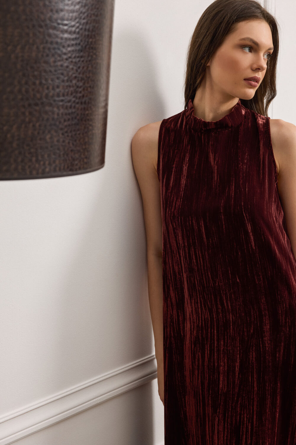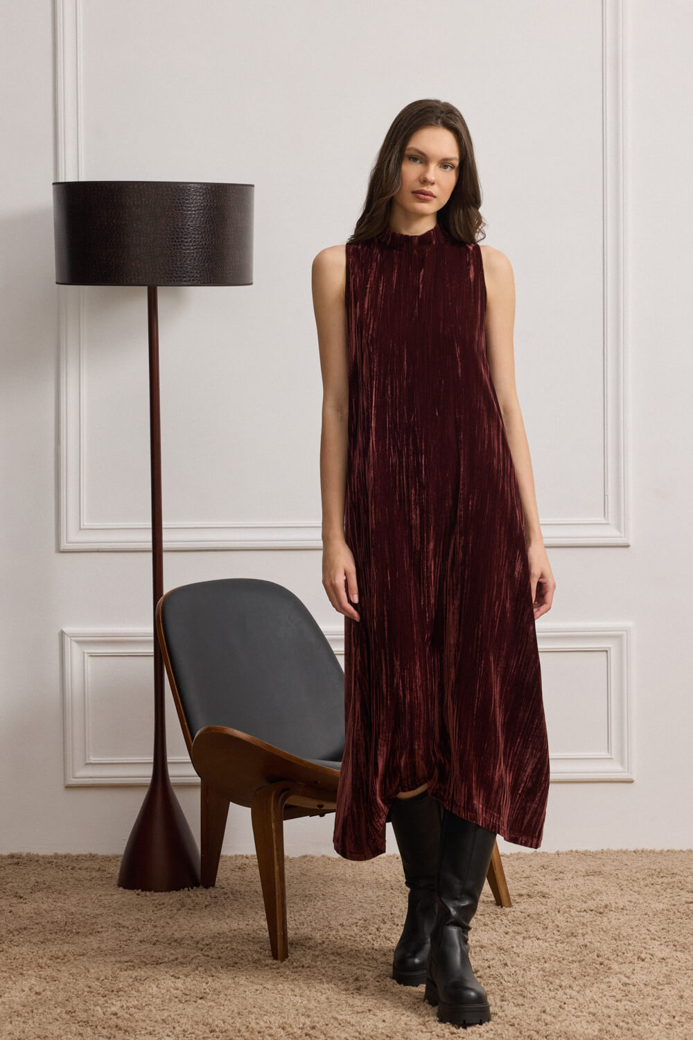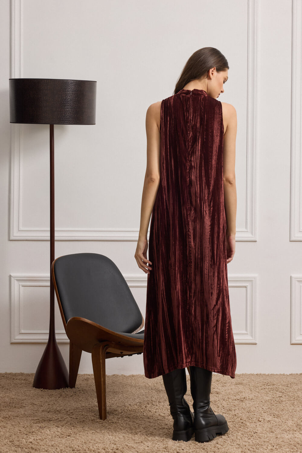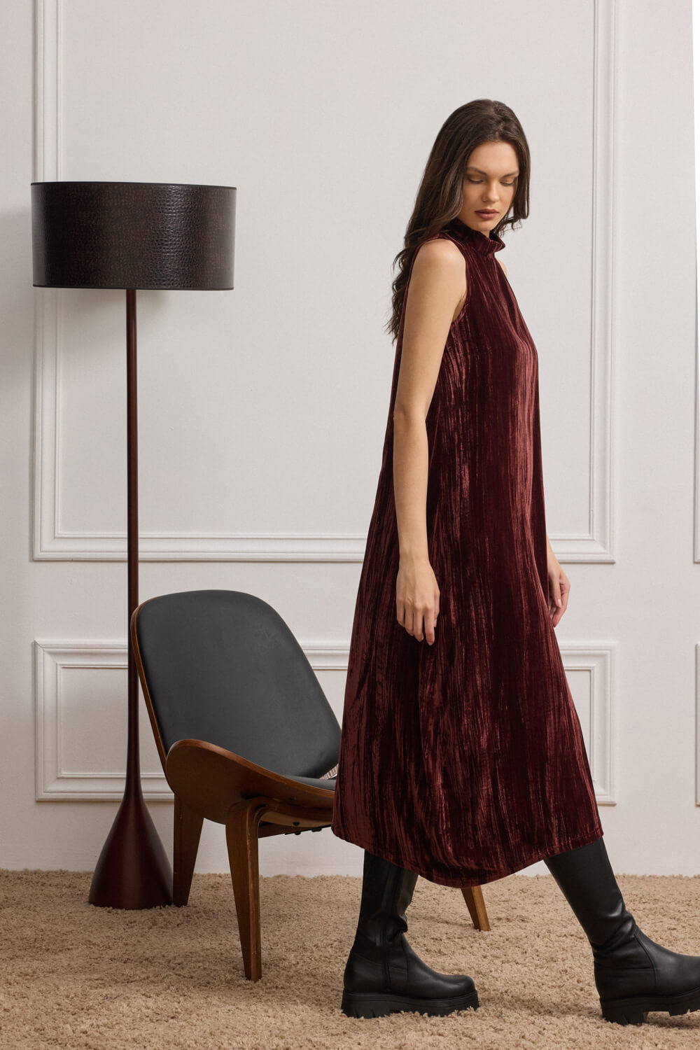 Το ιδιαίτερο crushed velvet πλισέ, χαρίζει βάθος και αναδεικνύει την κίνηση σε κάθε βήμα.