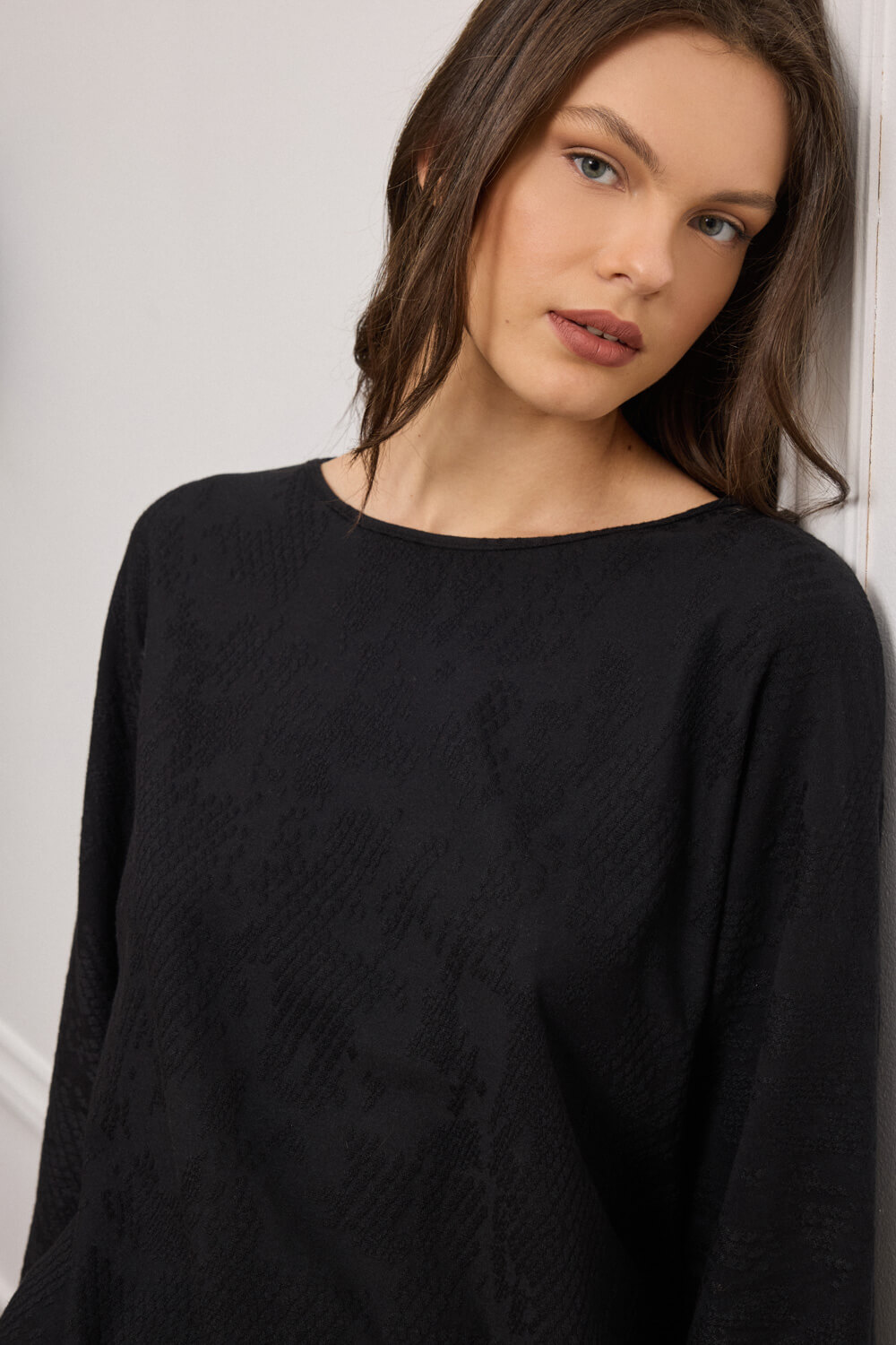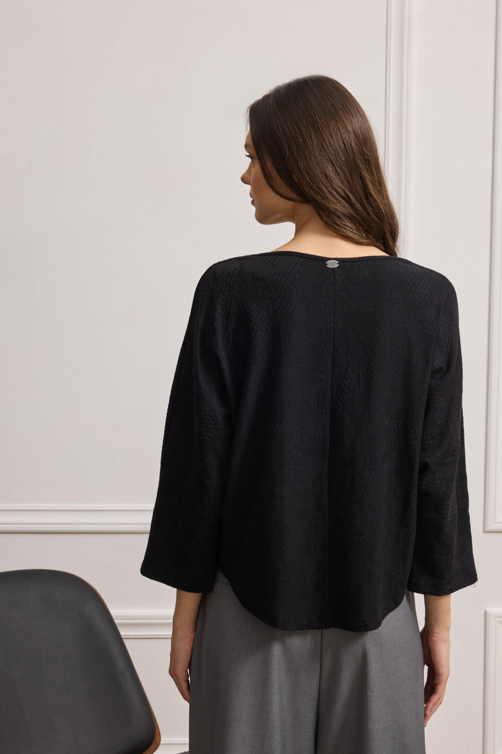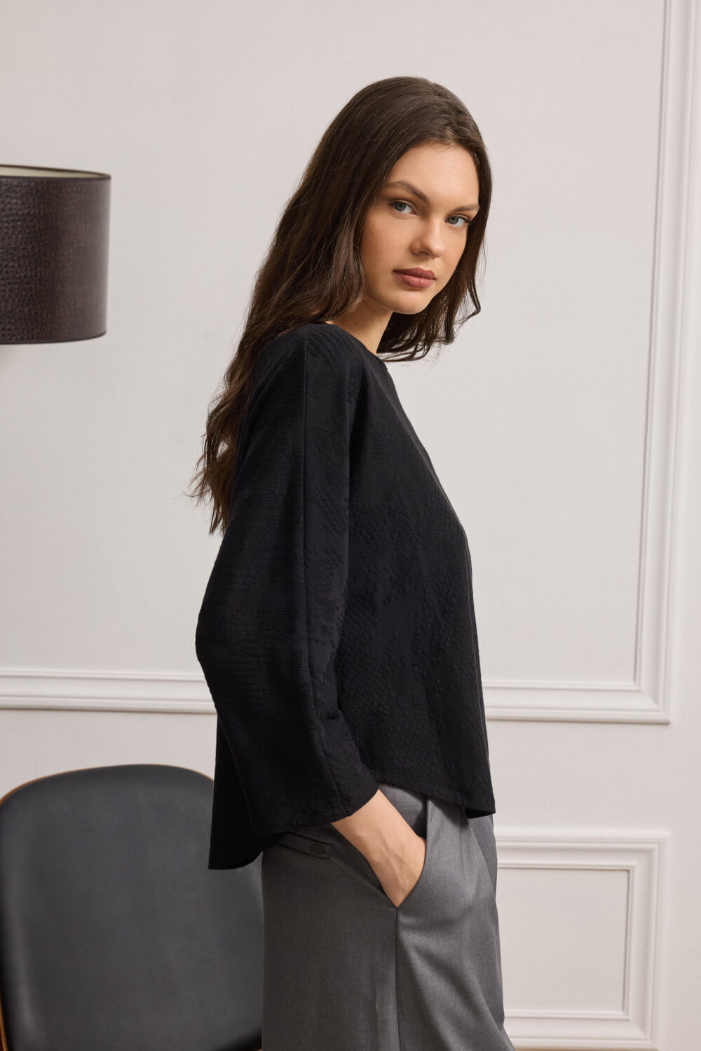 Μπλούζα από ελαφρύ ζακάρ ύφασμα με διακριτικό ανάγλυφο μοτίβο, που χαρίζει βάθος και υφή στην εμφάνιση.