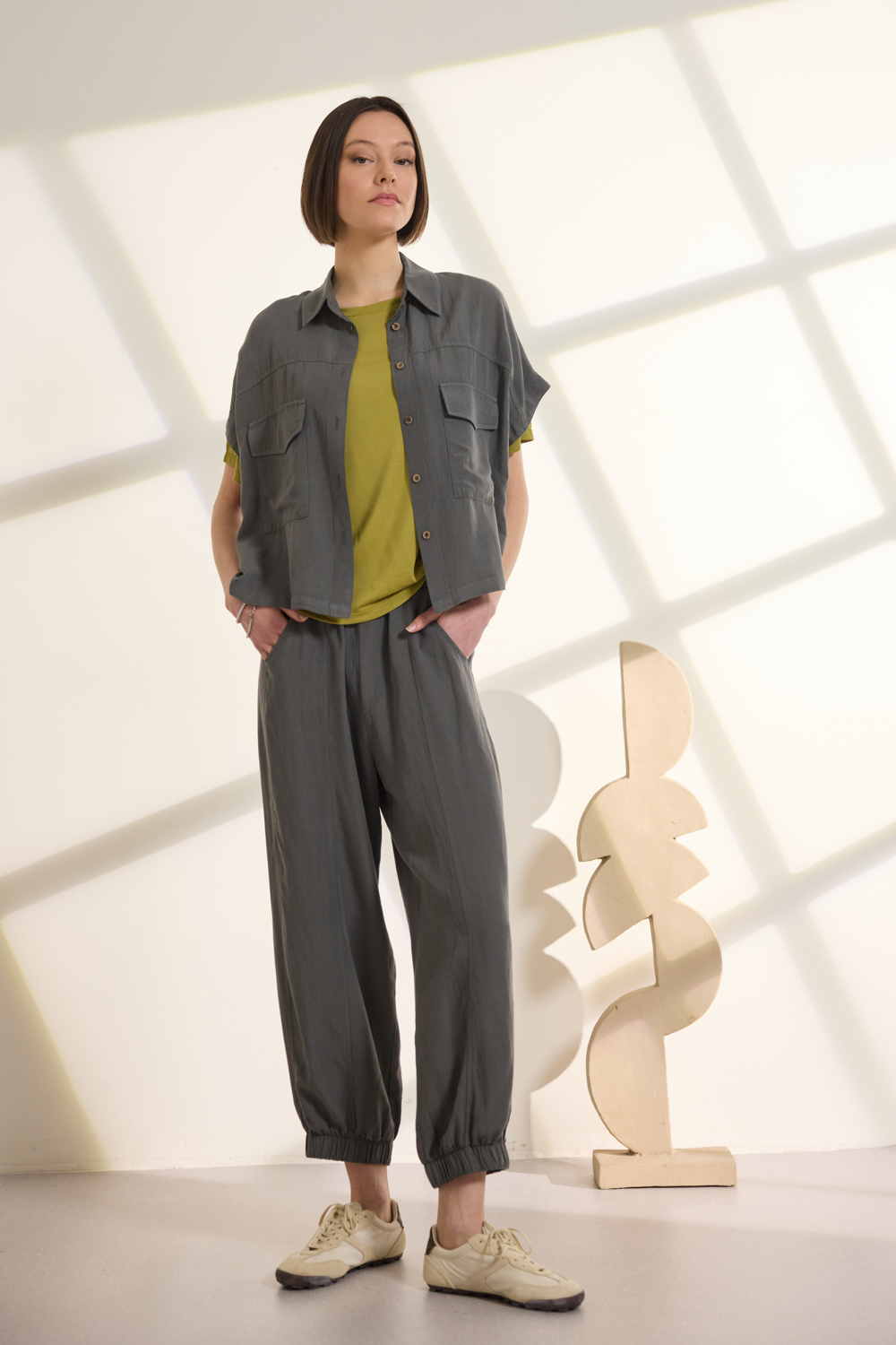 Τα κοντά μανίκια ολοκληρώνουν τη χαλαρή αισθητική,