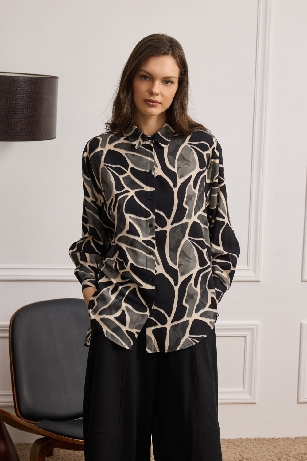 Oversized πουκάμισο από 100% βισκόζη με κλασικό γιακά και μακρύ μανίκι που καταλήγει σε μανσέτα με κουμπί.