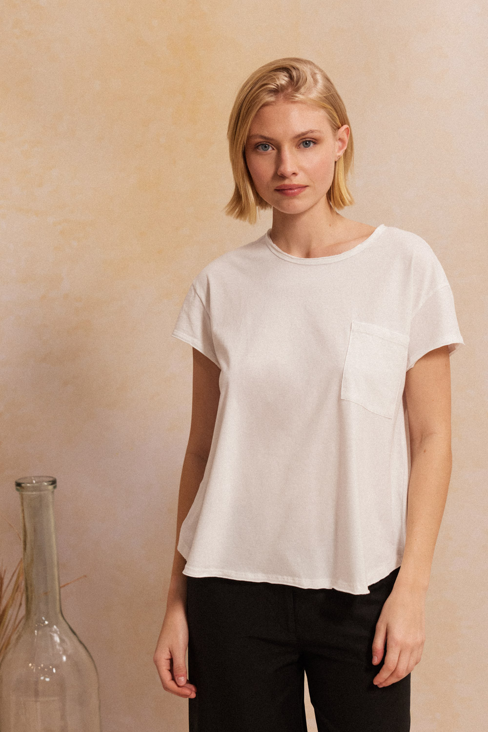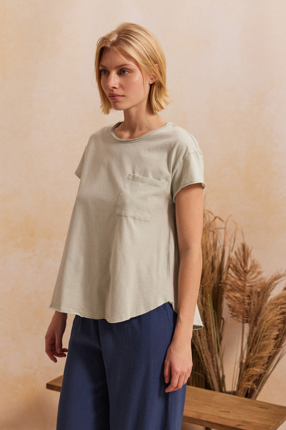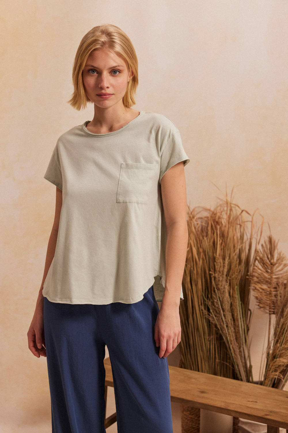 T-shirt με στρογγυλή λαιμόκοψη, τσέπη μπροστά και ασύμμετρο τελείωμα για μια μοντέρνα και χαλαρή εμφάνιση.