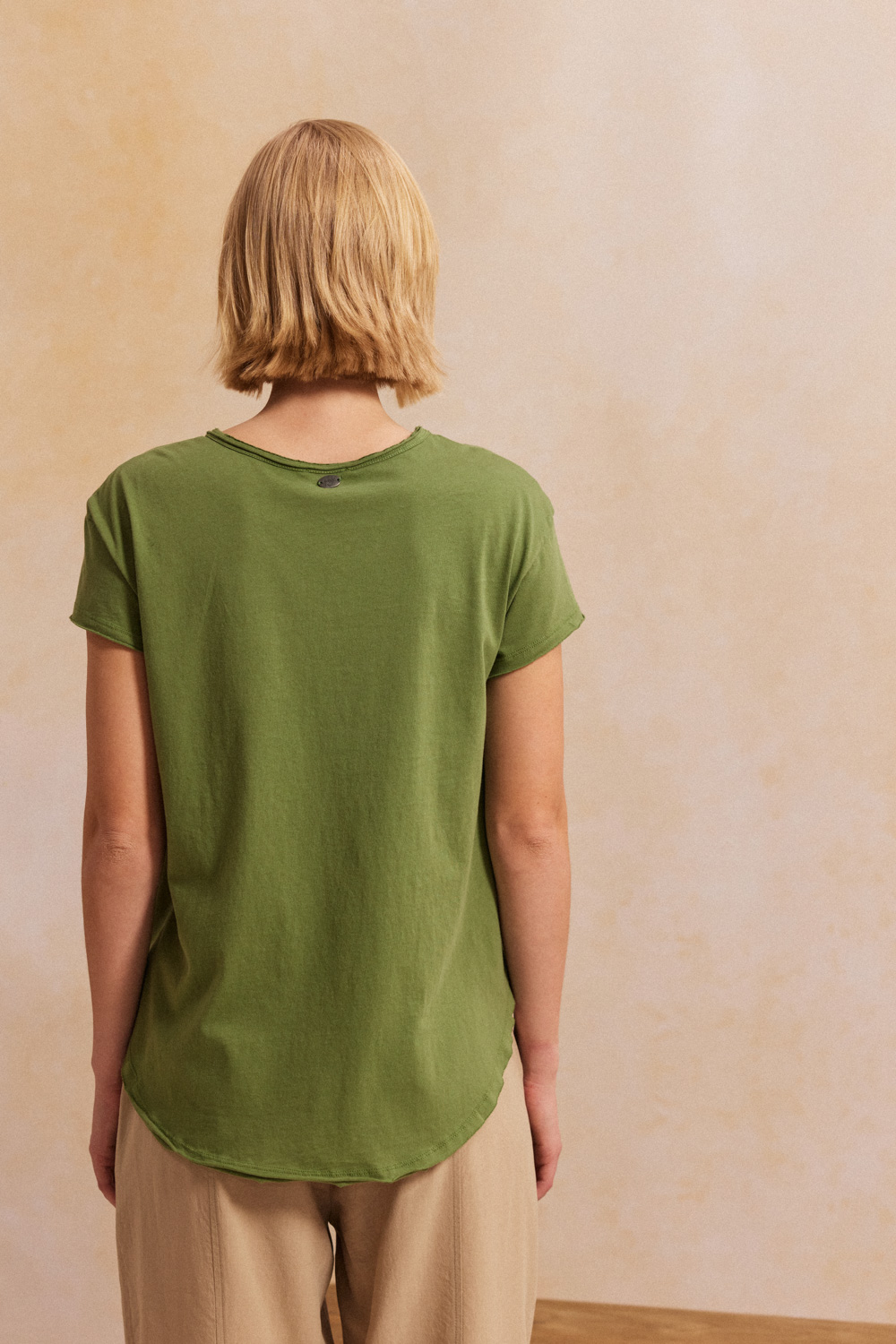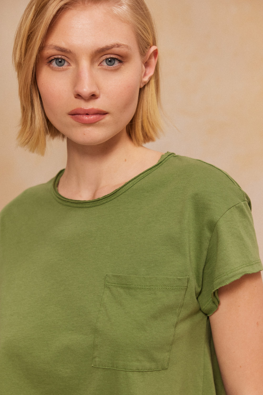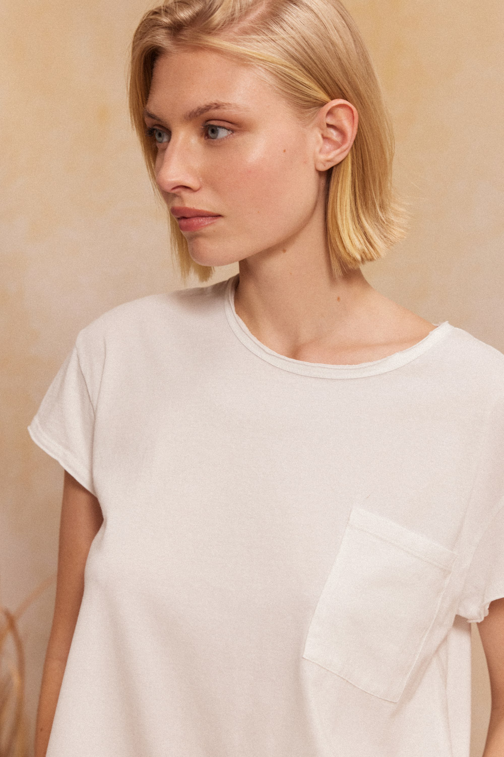 T-shirt με στρογγυλή λαιμόκοψη, τσέπη μπροστά και ασύμμετρο τελείωμα για μια μοντέρνα και χαλαρή εμφάνιση.