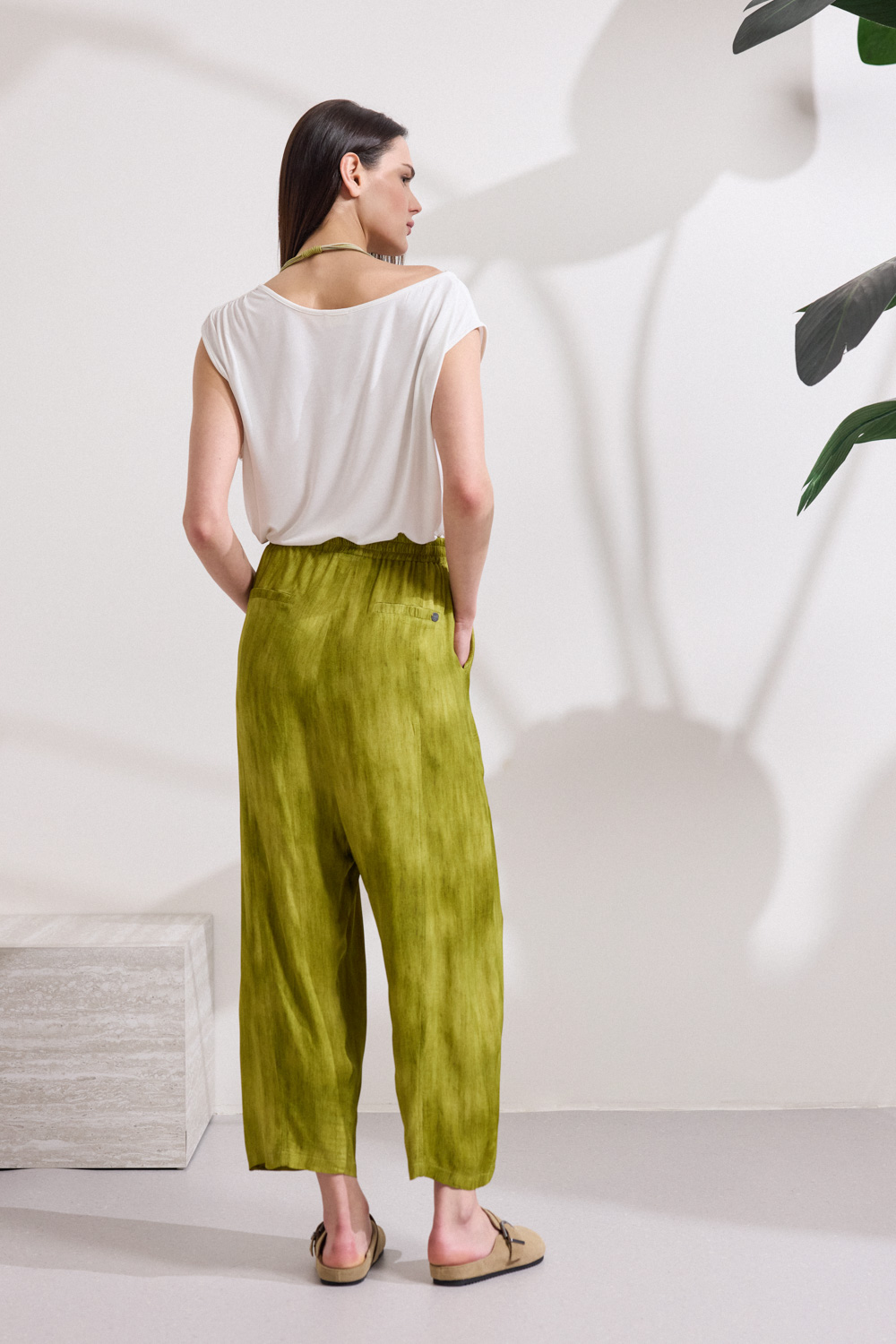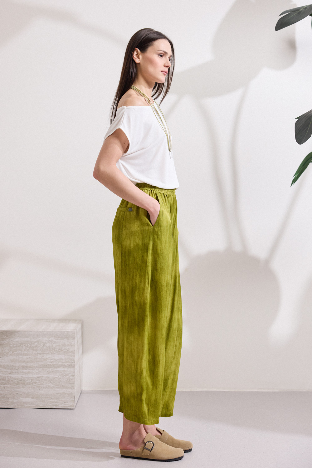 Παντελόνι με χαμηλό καβάλο από 100% viscose με σατινέ υφή, που προσφέρει απαλή αίσθηση και διακριτική λάμψη.