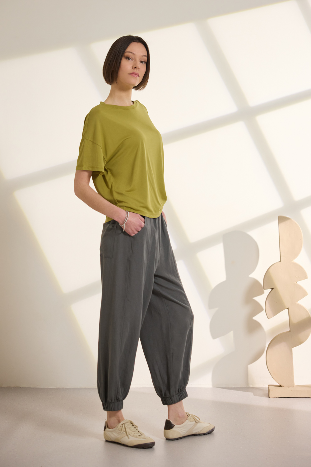 Ψηλόμεσο παντελόνι με λάστιχο στη μέση και στο τελείωμα για άνετη και σταθερή εφαρμογή.