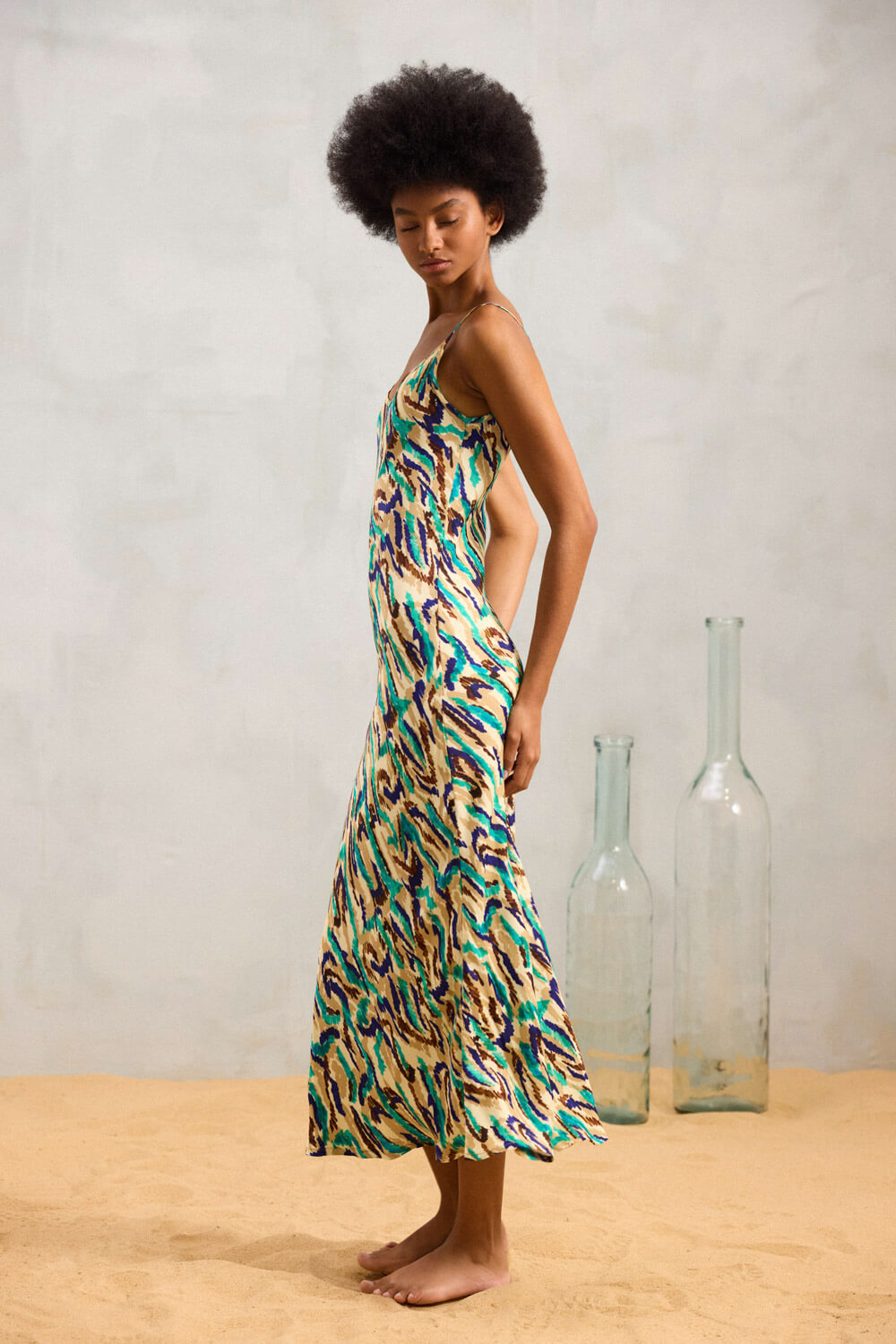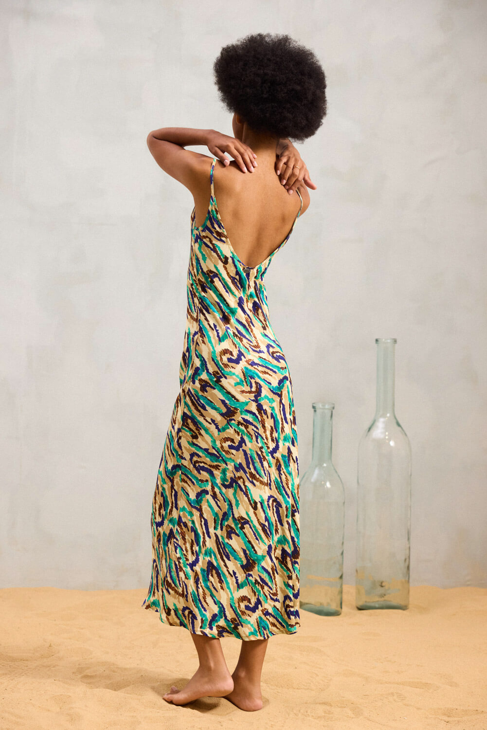 Φόρεμα midi από σατέν βισκόζη με απαλή υφή που είναι εφαρμοστό στο σώμα και χαρίζει διακριτική λάμψη.
