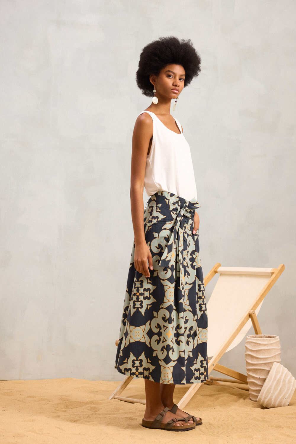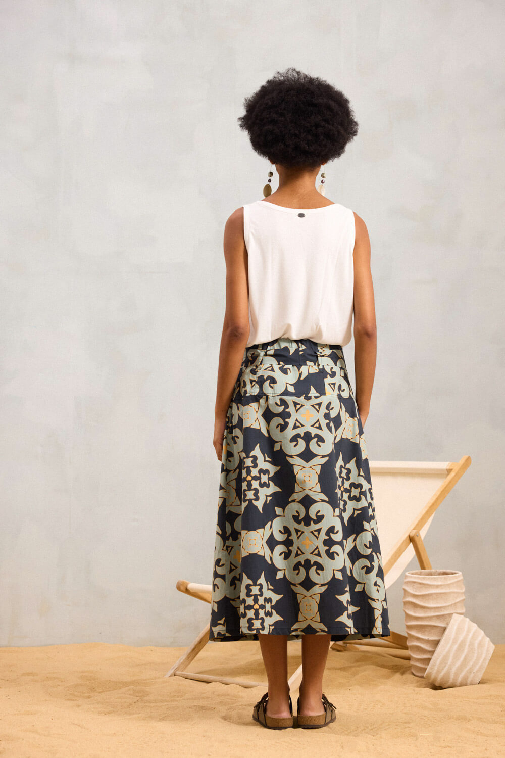 Midi φούστα από βαμβακερό ύφασμα, ιδανική για σύγχρονα looks με χαρακτήρα.