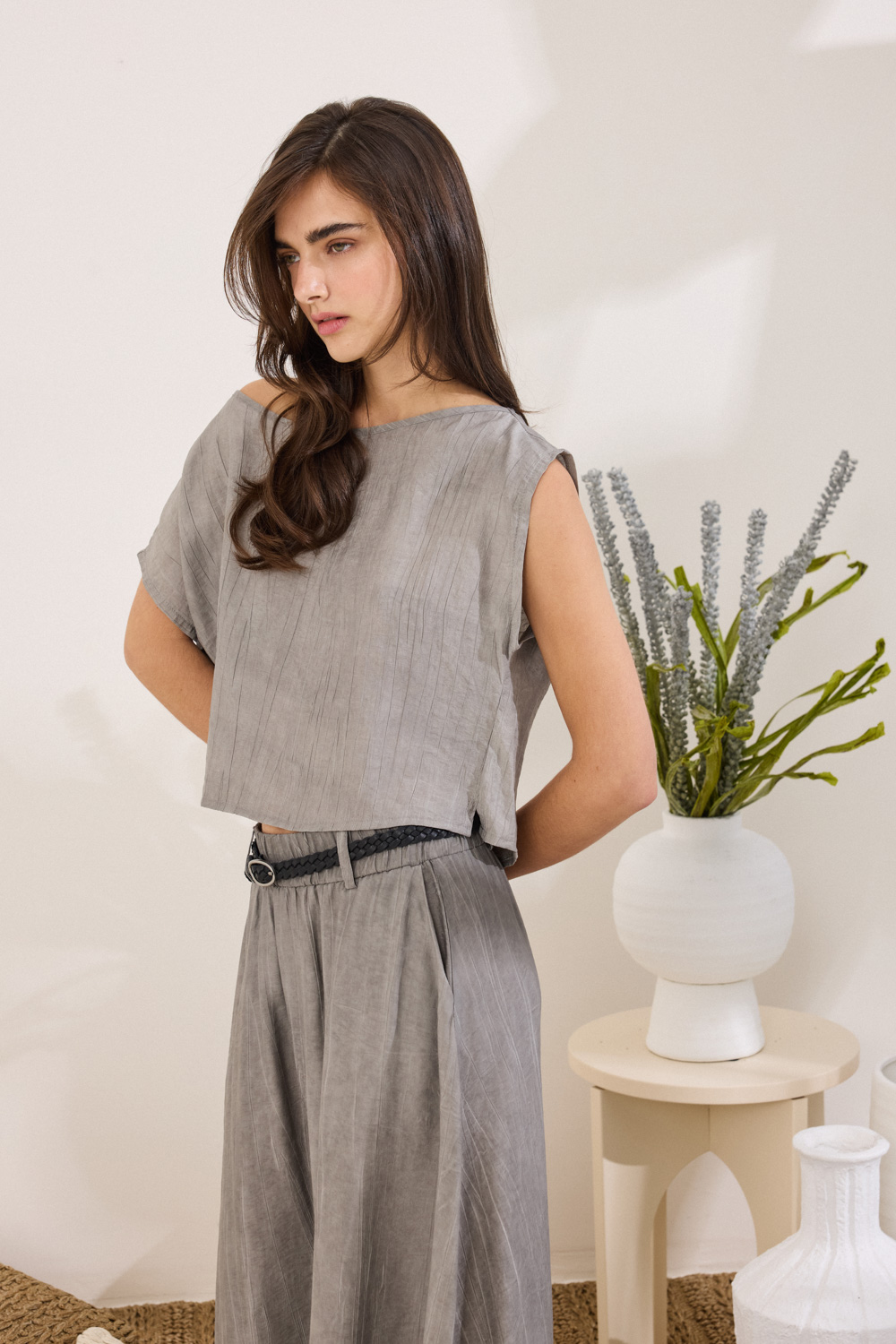 Η boxy γραμμή και το cropped μήκος δημιουργούν μια χαλαρή αλλά σύγχρονη σιλουέτα,