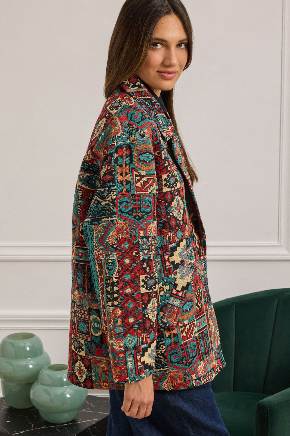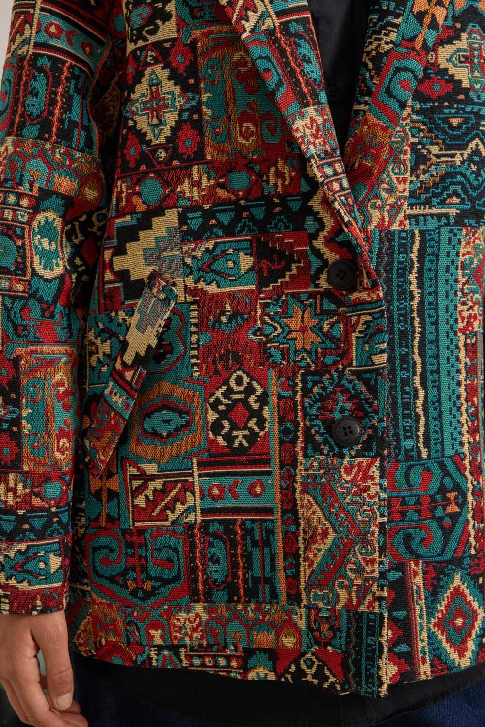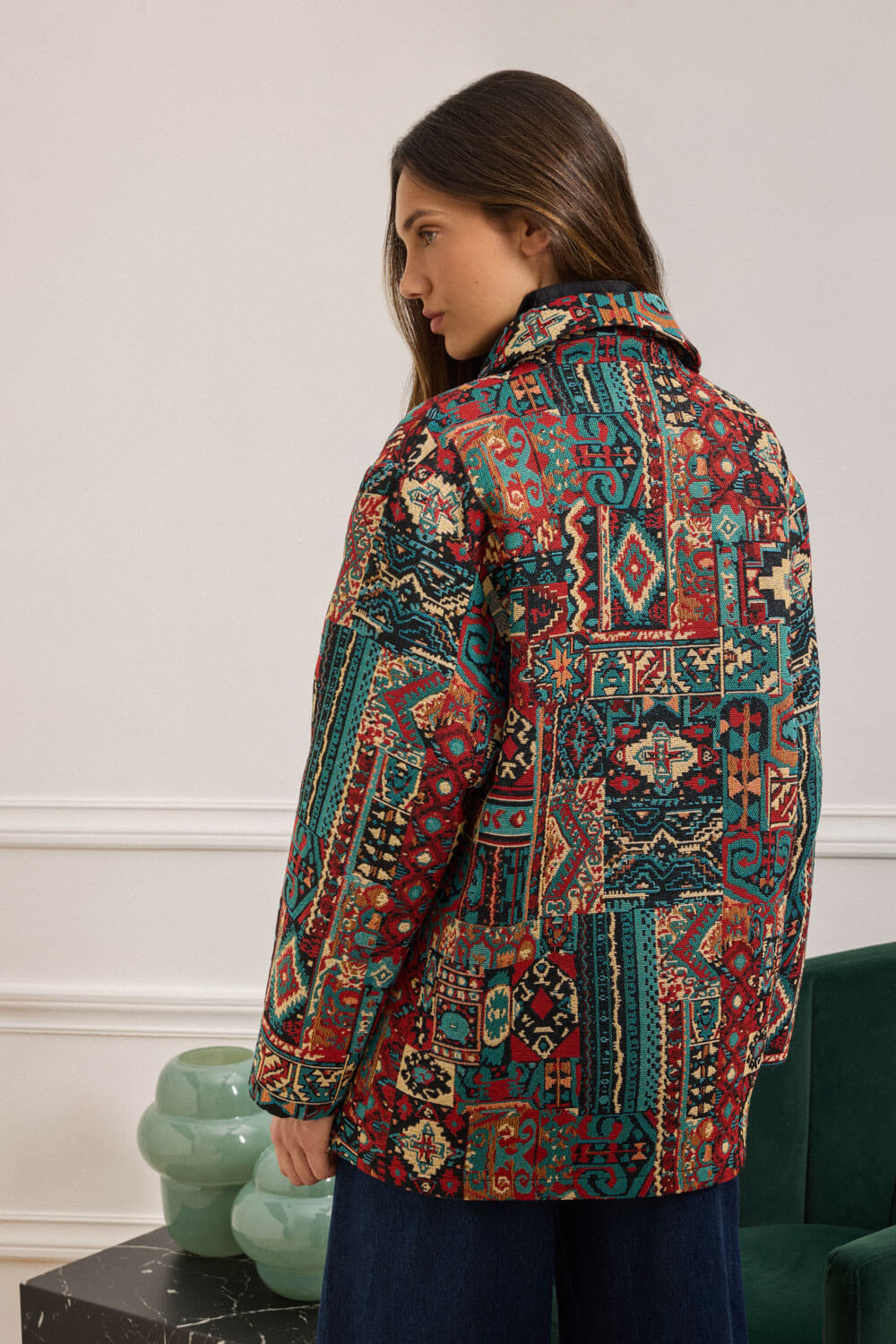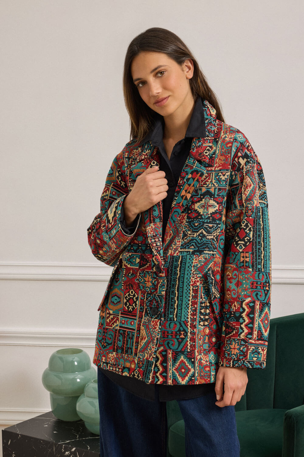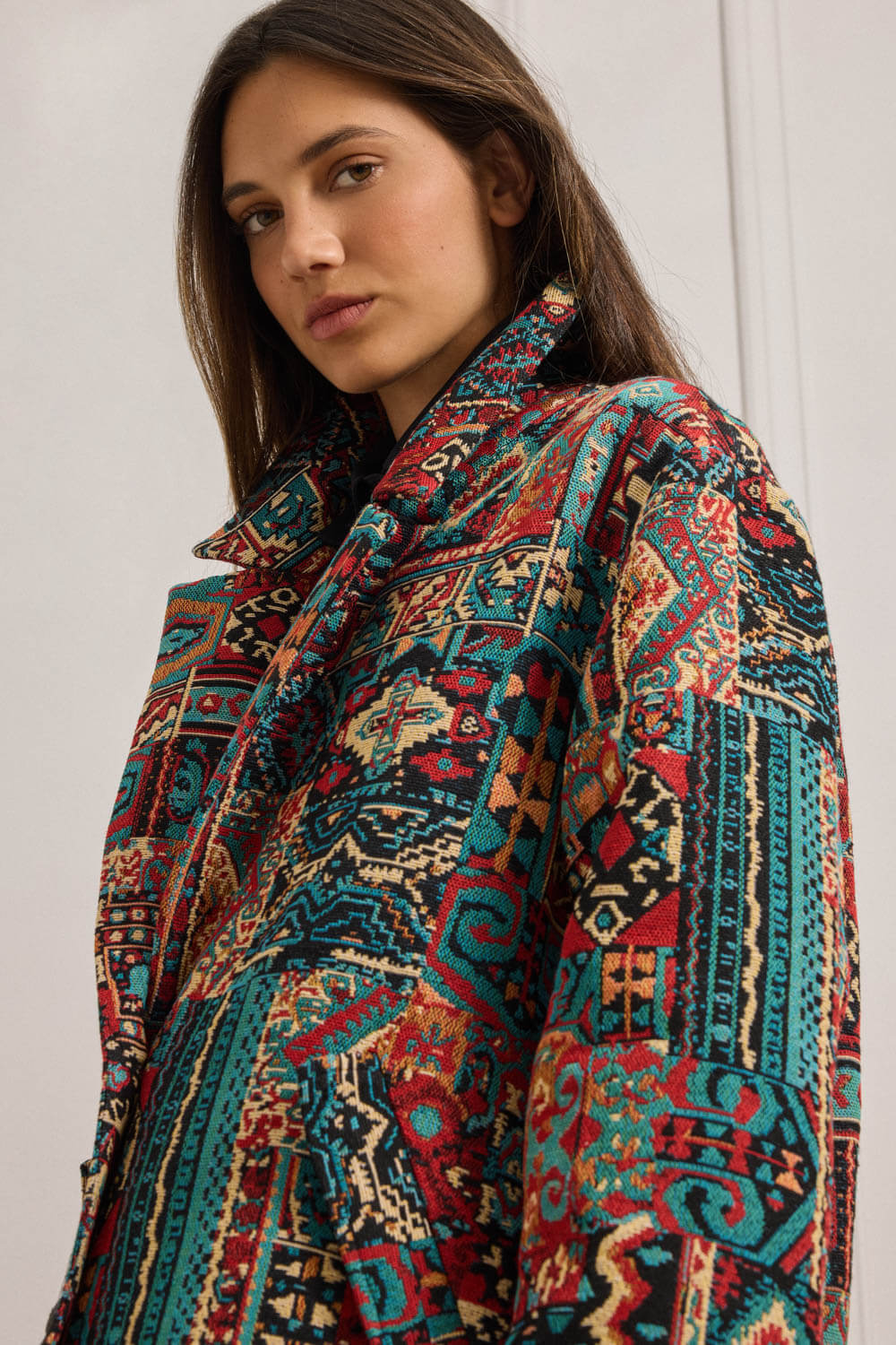 Ένα κομμάτι με προσωπικότητα. Πανωφόρι με δομημένη γραμμή και εντυπωσιακό ύφασμα σε υφαντό ethnic μοτίβο.