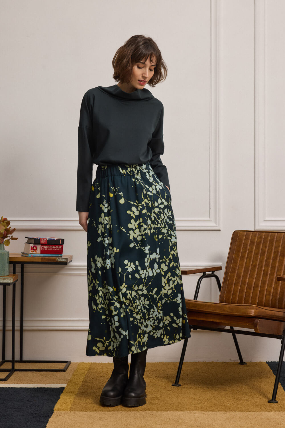 Midi φούστα σε εβαζέ γραμμή, με floral print σε αισθητική water color και ύφασμα από 100% viscoze Ecovero.
