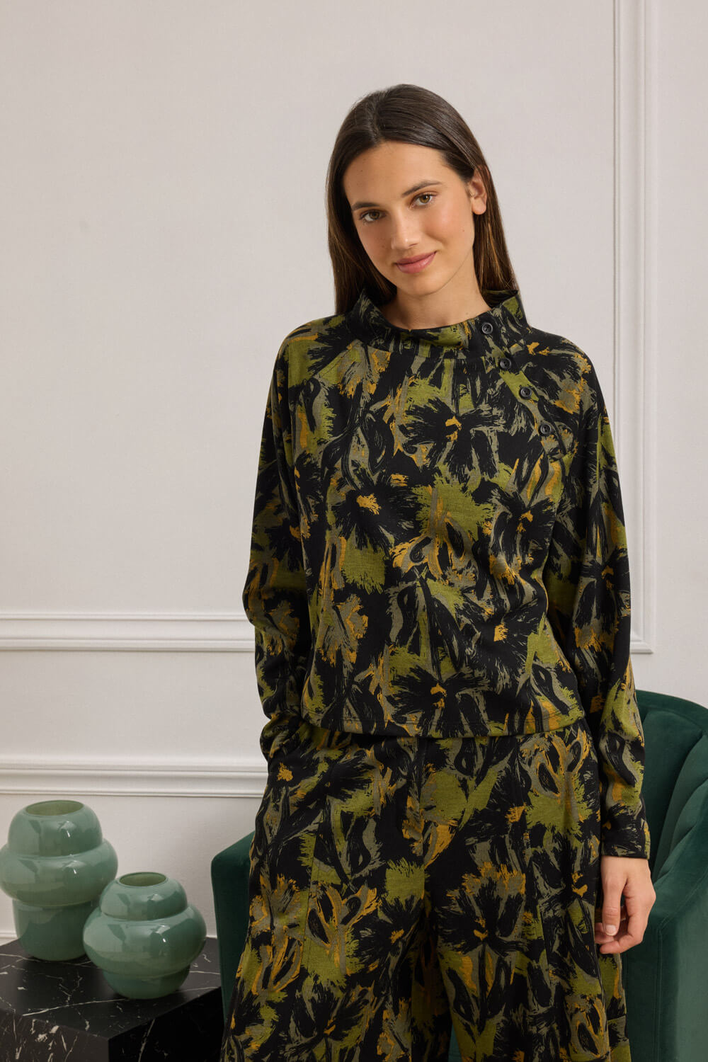 Το χαλαρό ζιβάγκο προσφέρει άνεση και στυλ, ενώ το κλείσιμο στο πλάι με κουμπιά