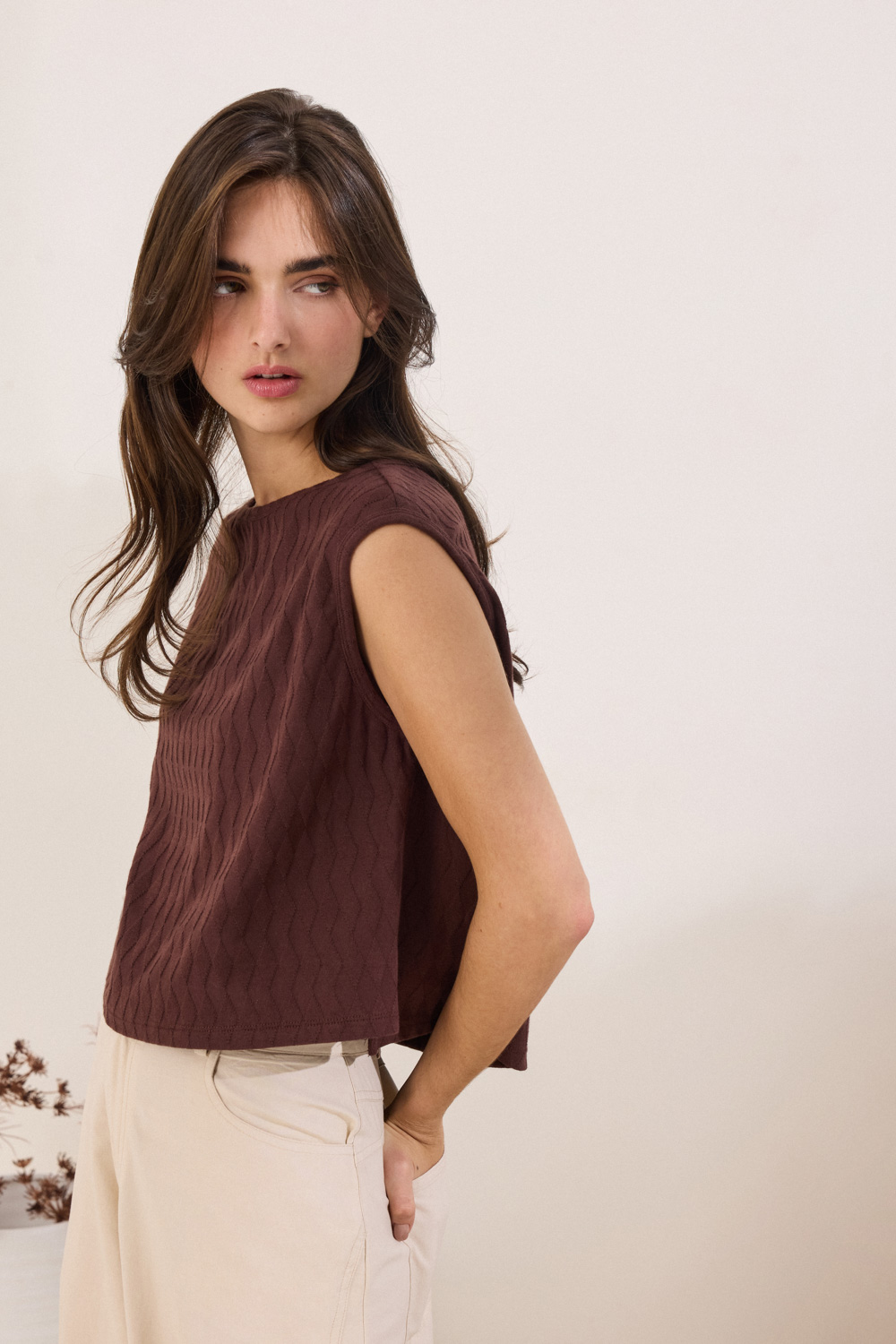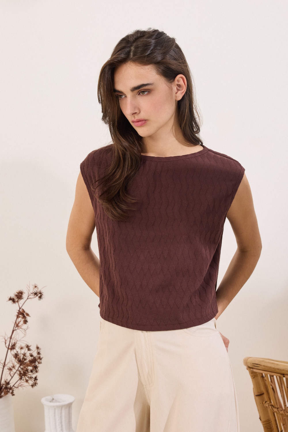 Η boxy γραμμή και η αμάνικη σχεδίαση διαμορφώνουν χαλαρή σιλουέτα,