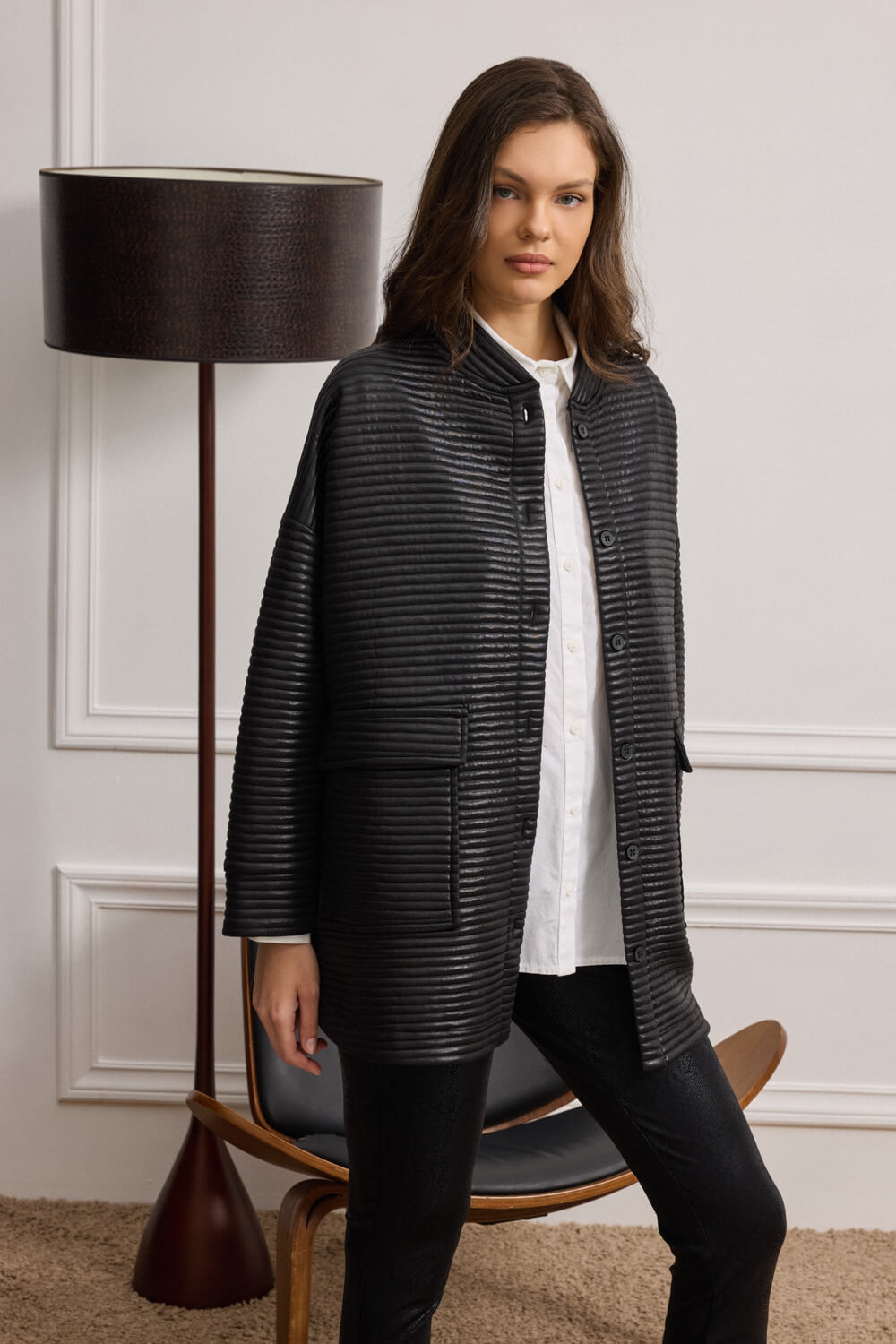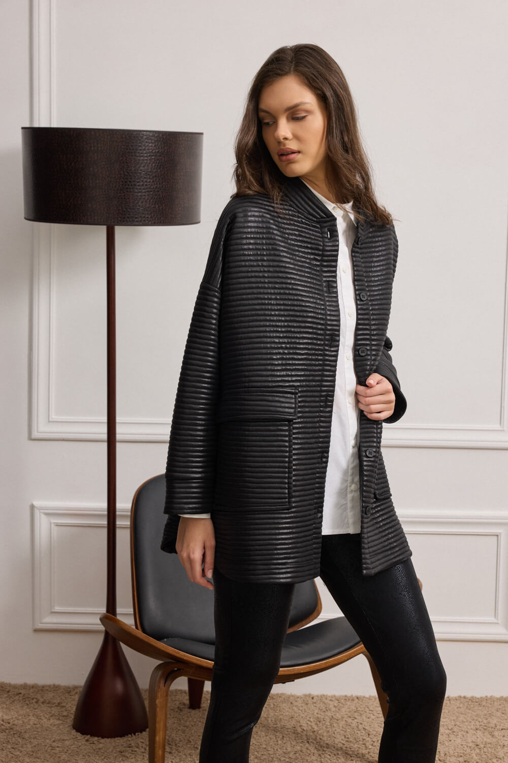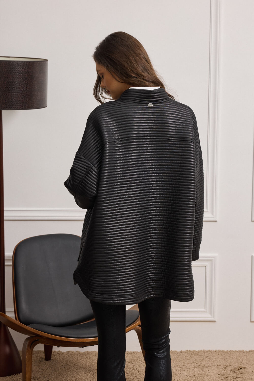 Ο όρθιος γιακάς αγκαλιάζει διακριτικά τον λαιμό, προσθέτοντας μοντέρνα δομή στο σύνολο.