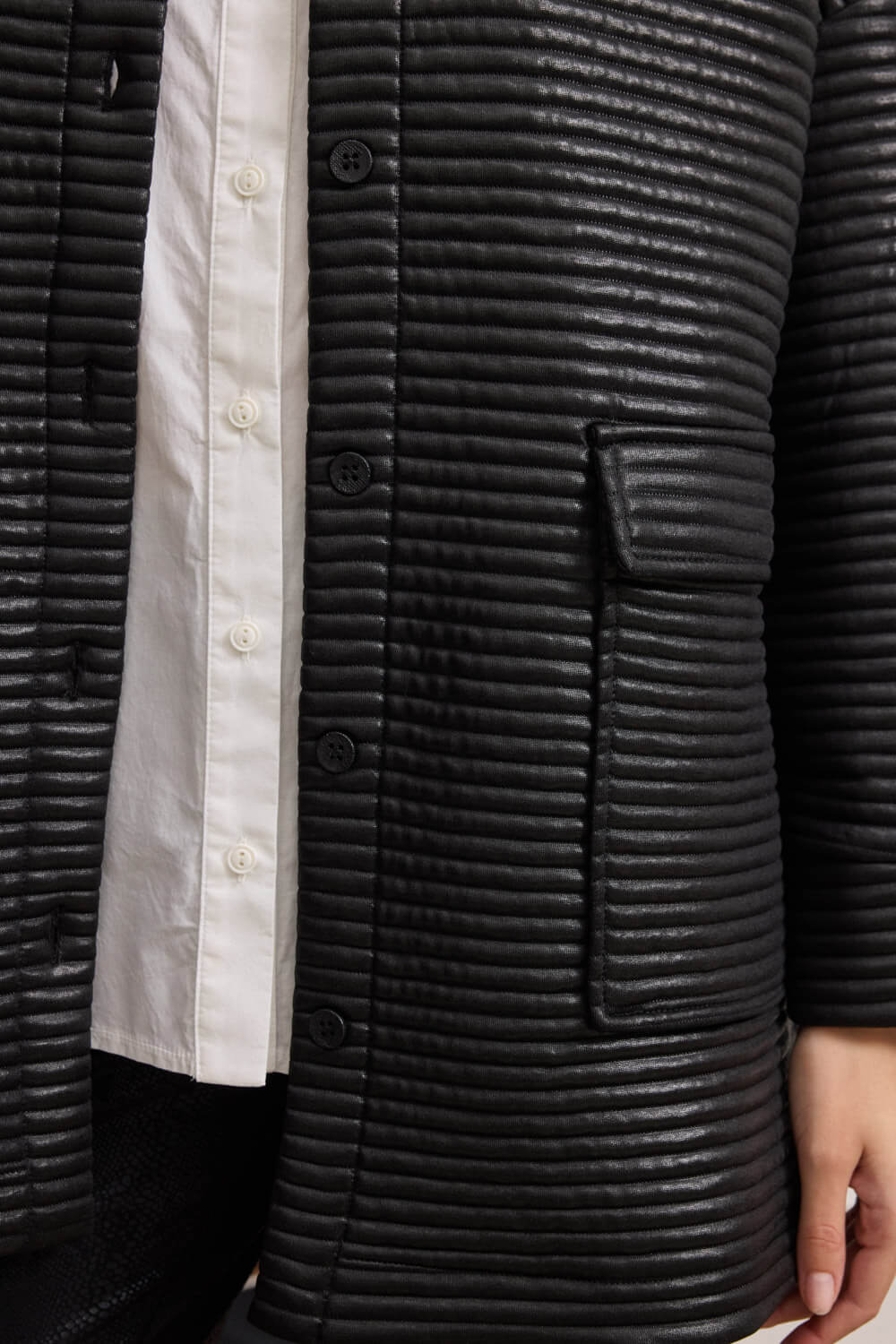 Το ελαφρώς γυαλιστερό καπιτονέ ύφασμα προσδίδει διακριτική λάμψη, ενώ η oversized εφαρμογή απογειώνει το casual cool look.