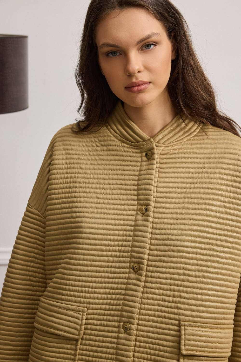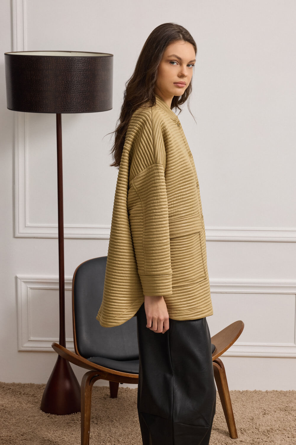 Το ελαφρώς γυαλιστερό καπιτονέ ύφασμα προσδίδει διακριτική λάμψη, ενώ η oversized εφαρμογή απογειώνει το casual cool look.