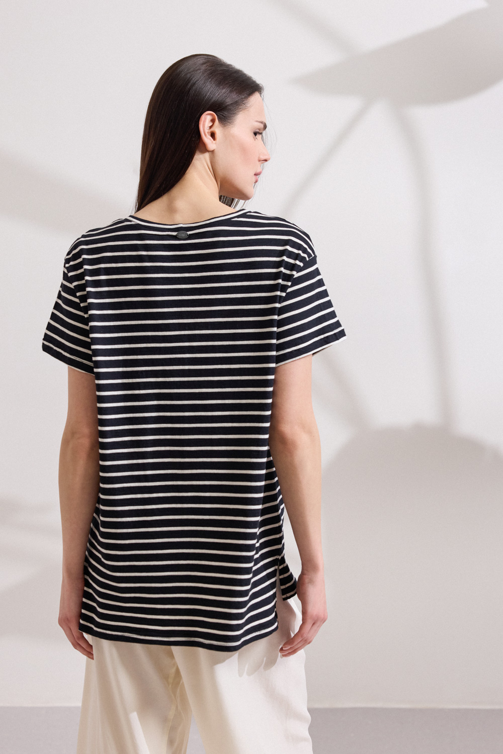 Διακοσμείται με οριζόντιες ρίγες σε διαχρονικό ύφος, ενώ η γραμμή της είναι χαλαρή.