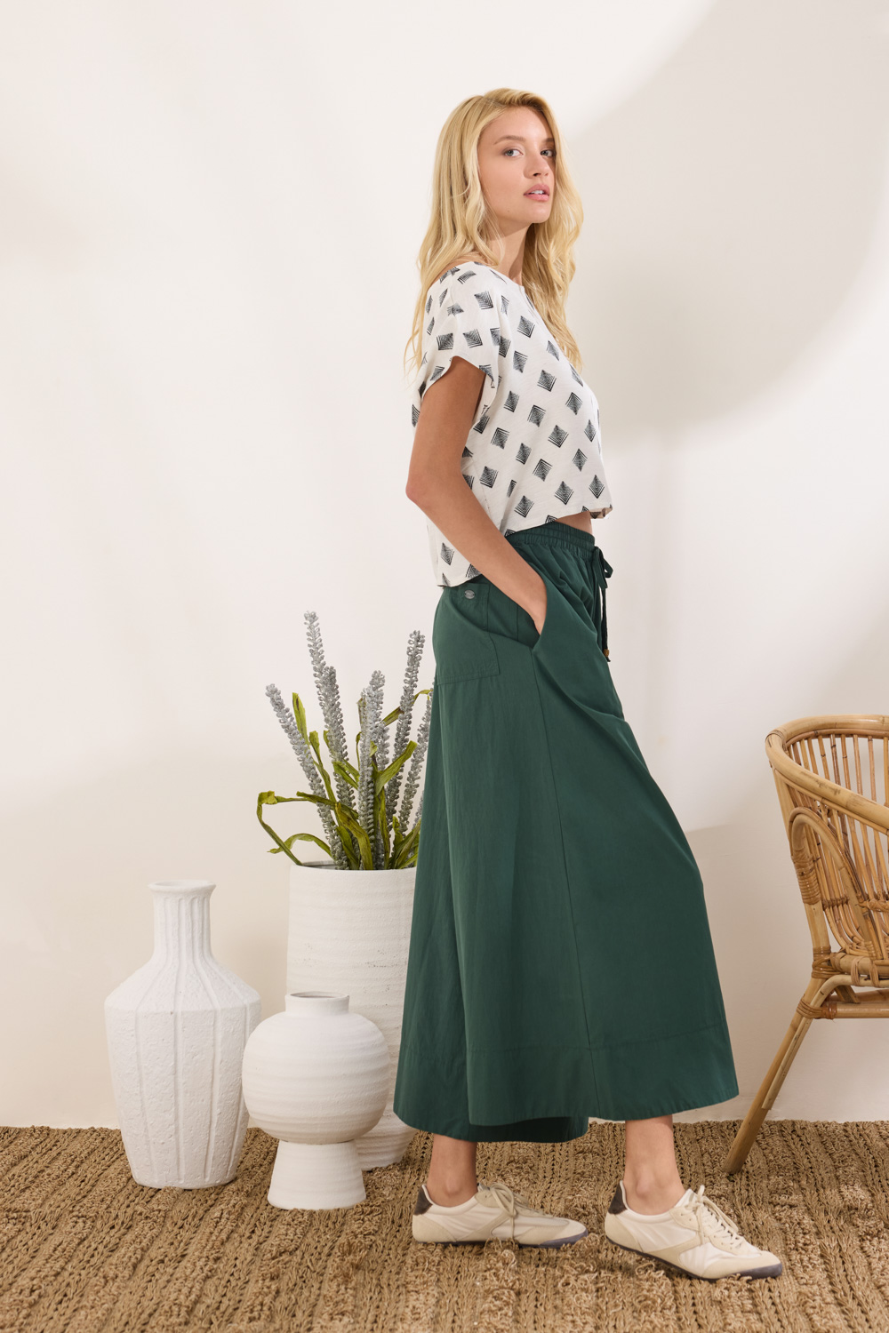 τσέπες και cropped μήκος με φαρδύ στρίφωμα στο κάτω μέρος, δημιουργώντας ισχυρό statement.