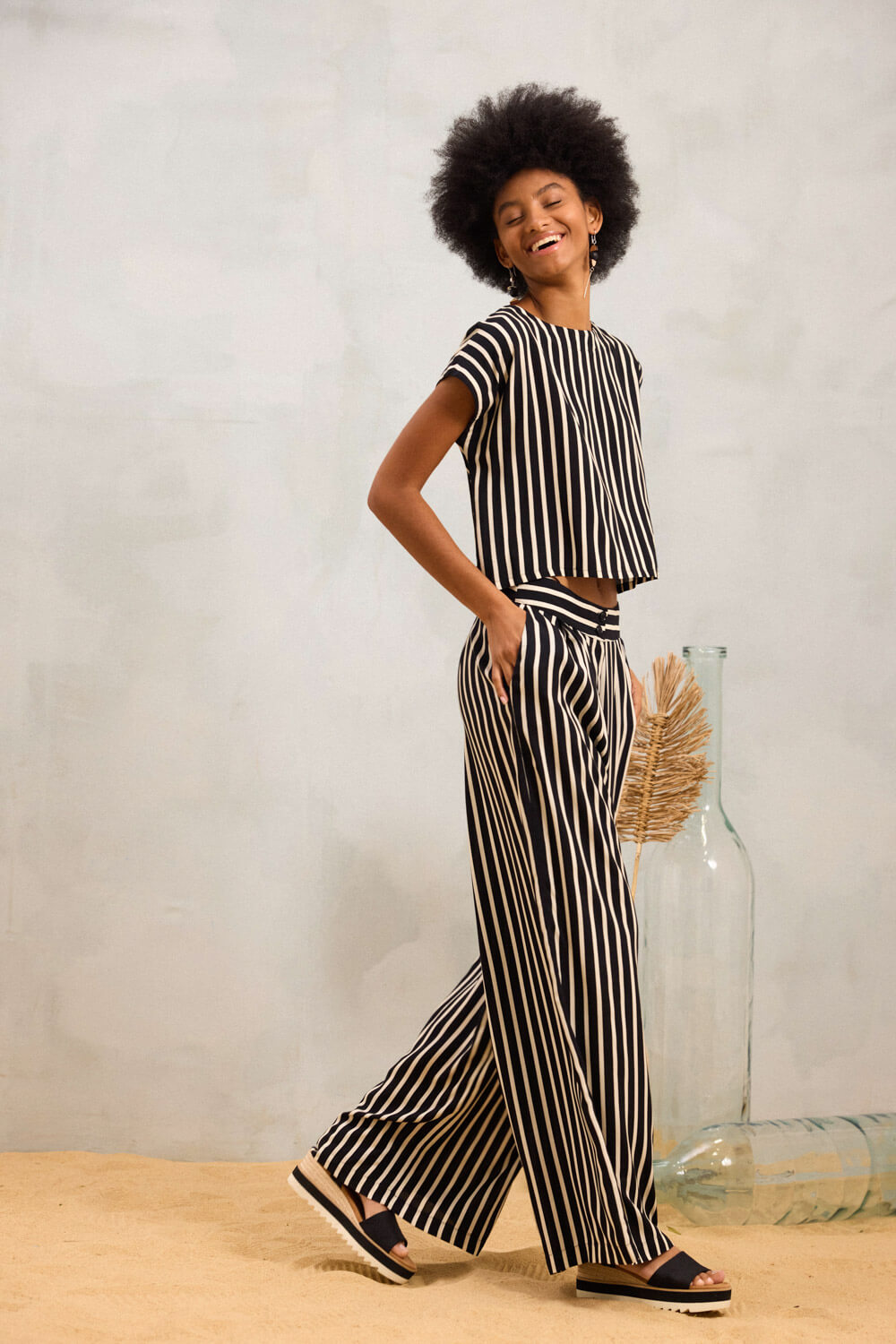 Οι κάθετες φαρδιές ρίγες ενισχύουν τη ρευστότητα και τη γραμμικότητα της σιλουέτας.